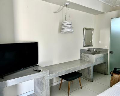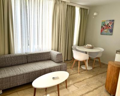 Les chambres indépendantes sont dotées de la climatisation ainsi que d'un balcon surplombant la mer Égée ou les jardins et la piscine d'eau de mer. Elles sont pourvues d'une kitchenette avec un réfrigérateur, d'une télévision ainsi que d'une connexion Wi-Fi gratuite.
