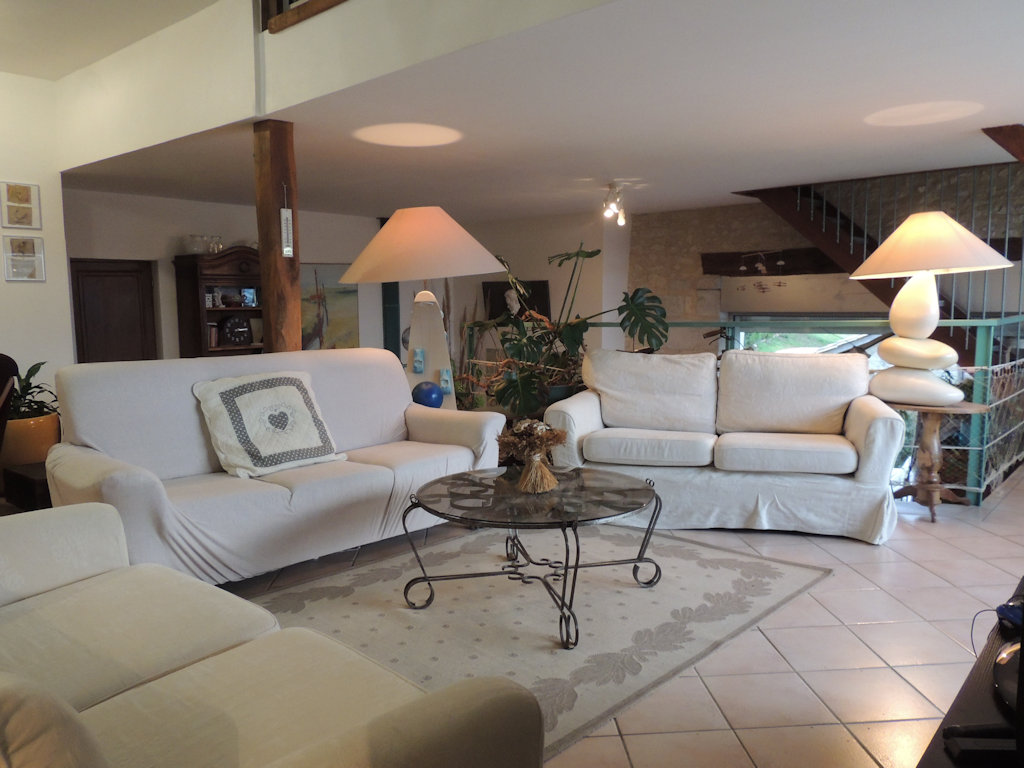 • salon de 55 m², avec mezzanine sur salle de gym, et baie vitrée (6m de large) sur la terrasse intérieure qui donne sur la vallée. Le salon comporte un piano, un canapé, des fauteuils, une table basse, une table de jeux, différents meubles, un téléviseur grand écran avec lecteur DVD blu-Ray, un home cinéma, un poêle …