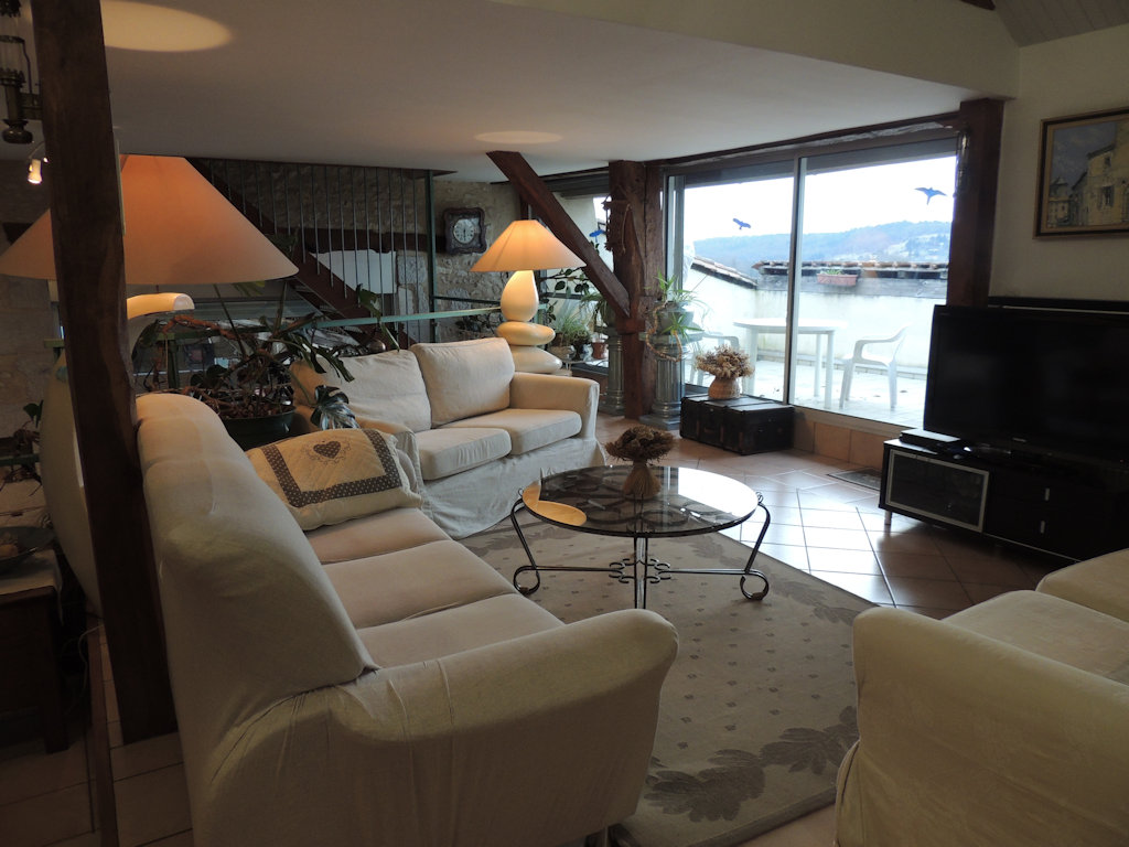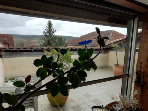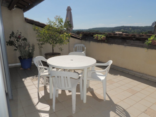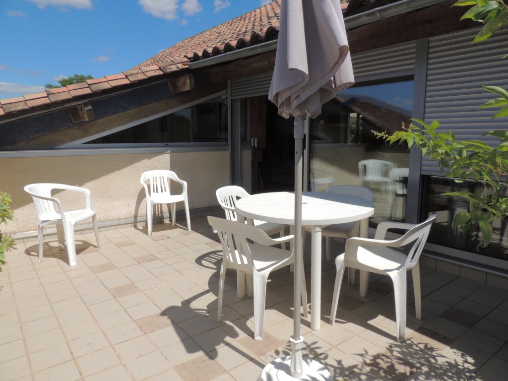 • terrasse de 19 m², avec table et fauteuils, orientée à l’ouest, avec une jolie vue sur le village et la vallée