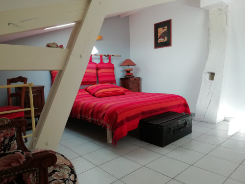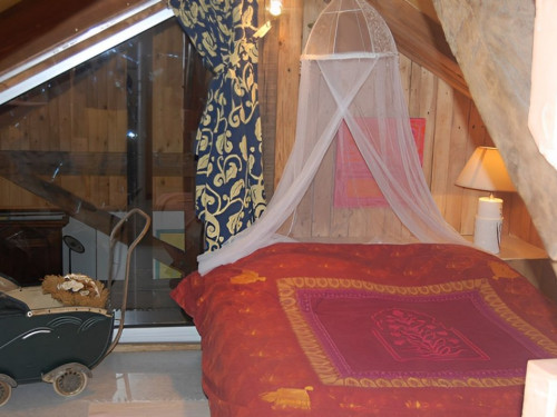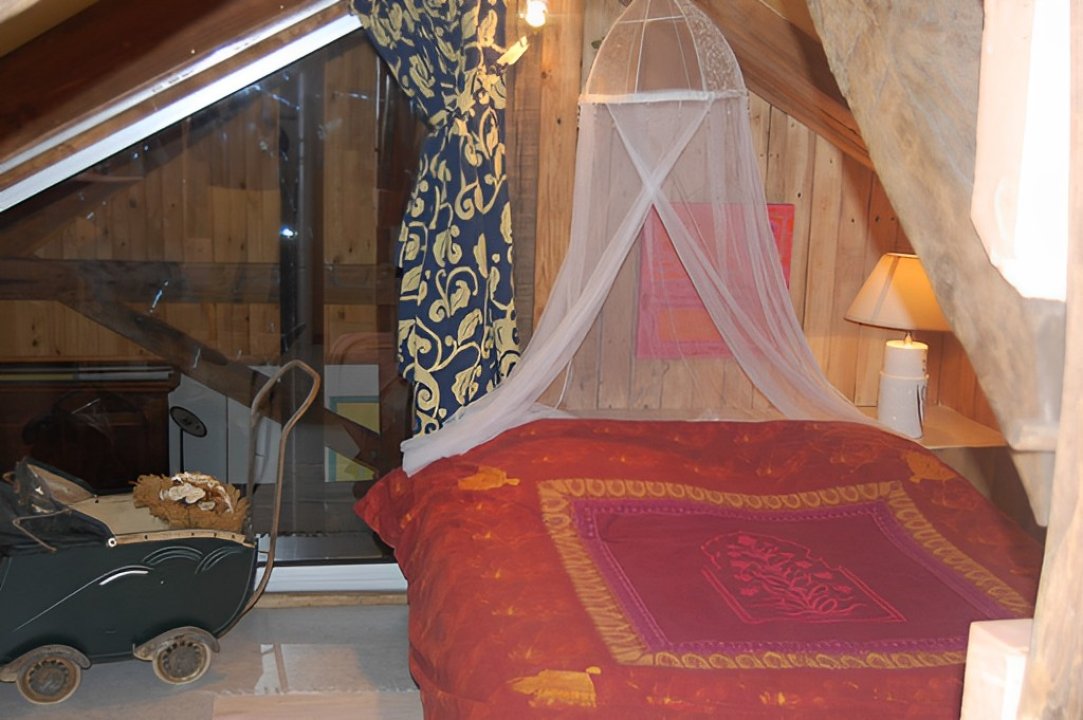 • la chambre du « haut » avec un lit de 140cm et un lit de 90cm, un meuble de rangement, une baie vitrée triangulaire non ouvrante qui donne sur le grand salon (en hauteur) et un velux ouvrant au sud-est