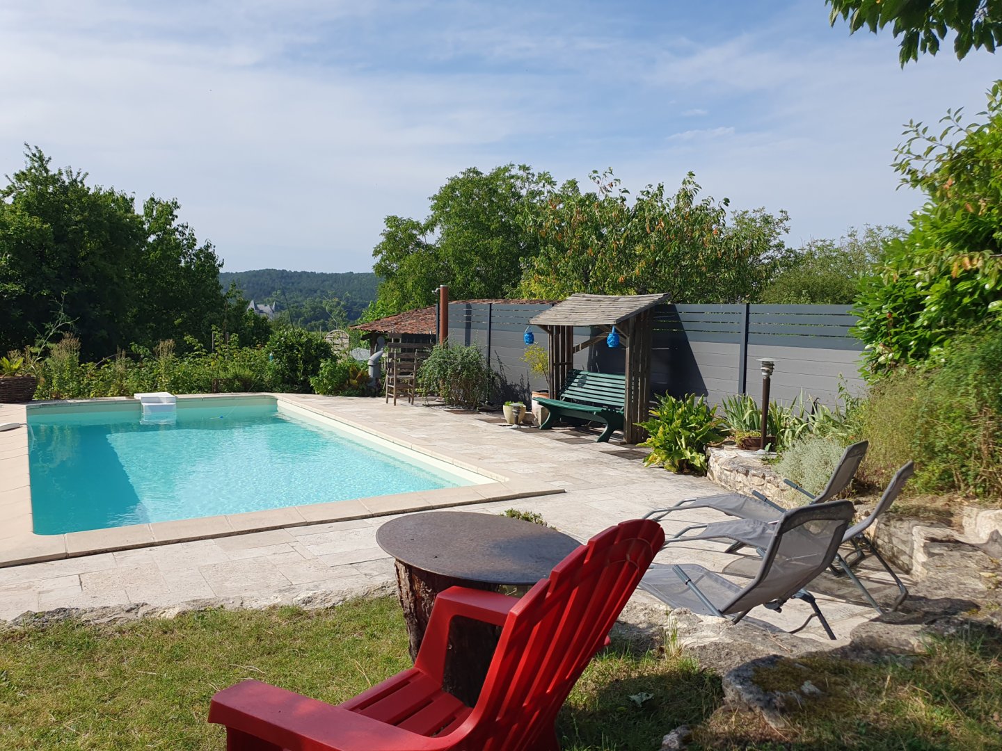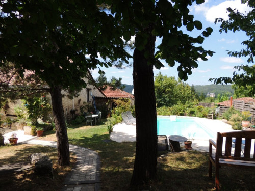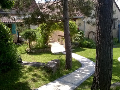 • jardin arboré avec cabane en bois pour les enfants et salons de jardin. Belle vue sur le château des Bories