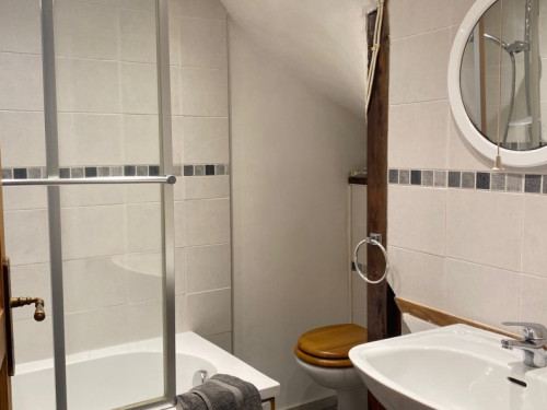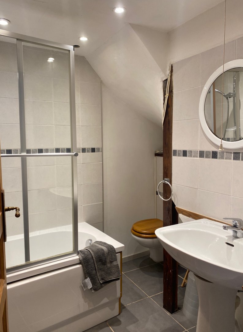 - une salle de bain avec baignoire sabot et douche, 1 toilette, un évier