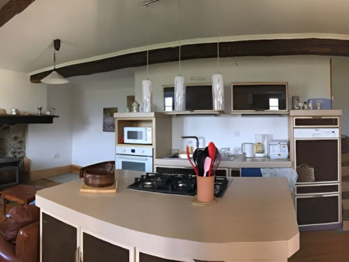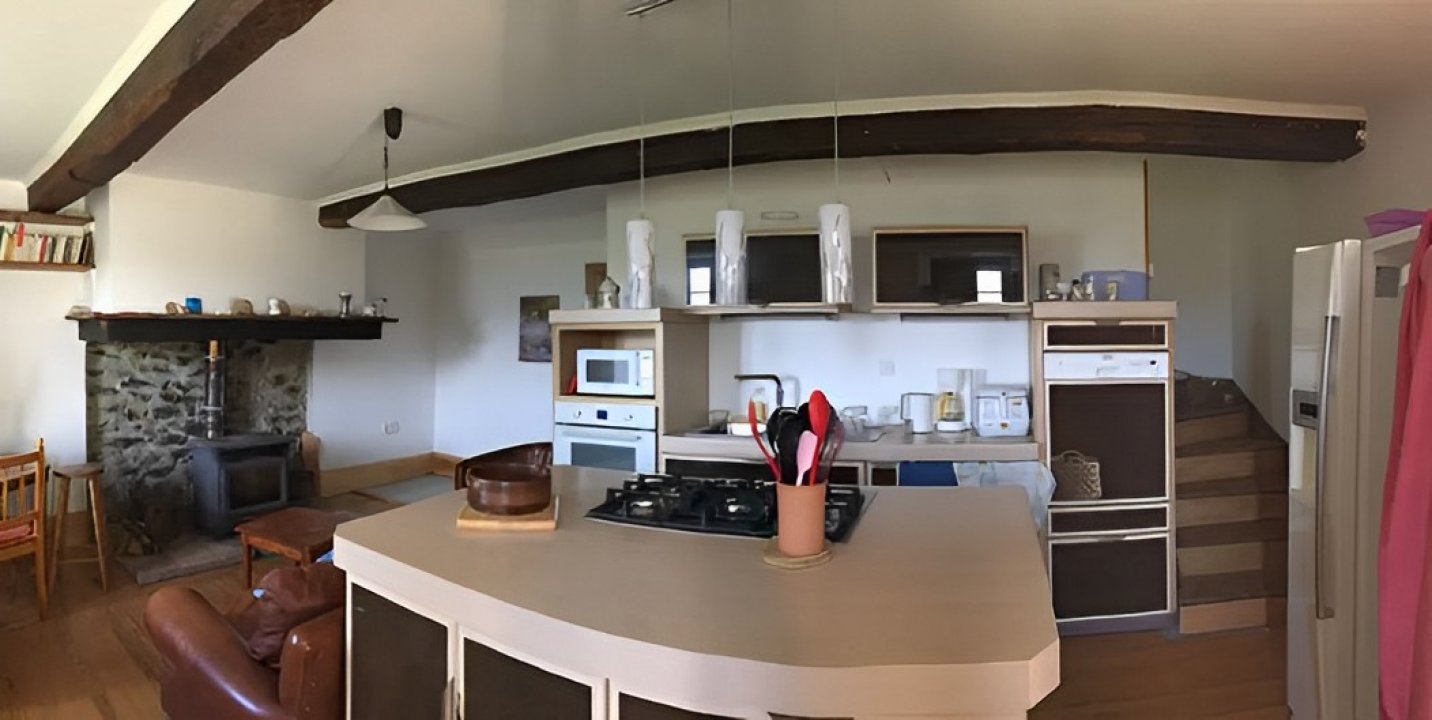 - une pièce à vivre avec coin repas, 2 tables et 4 chaises, 2 tabourets, un poêle à bois, un canapé et un fauteuil cuir pour lecture, et une partie cuisine avec un îlot central offrant une plaque 5 gaz, four, micro-ondes, réfrigérateur-congélateur, lave-vaisselle, lave-linge, 2 radiateurs
