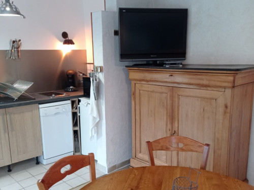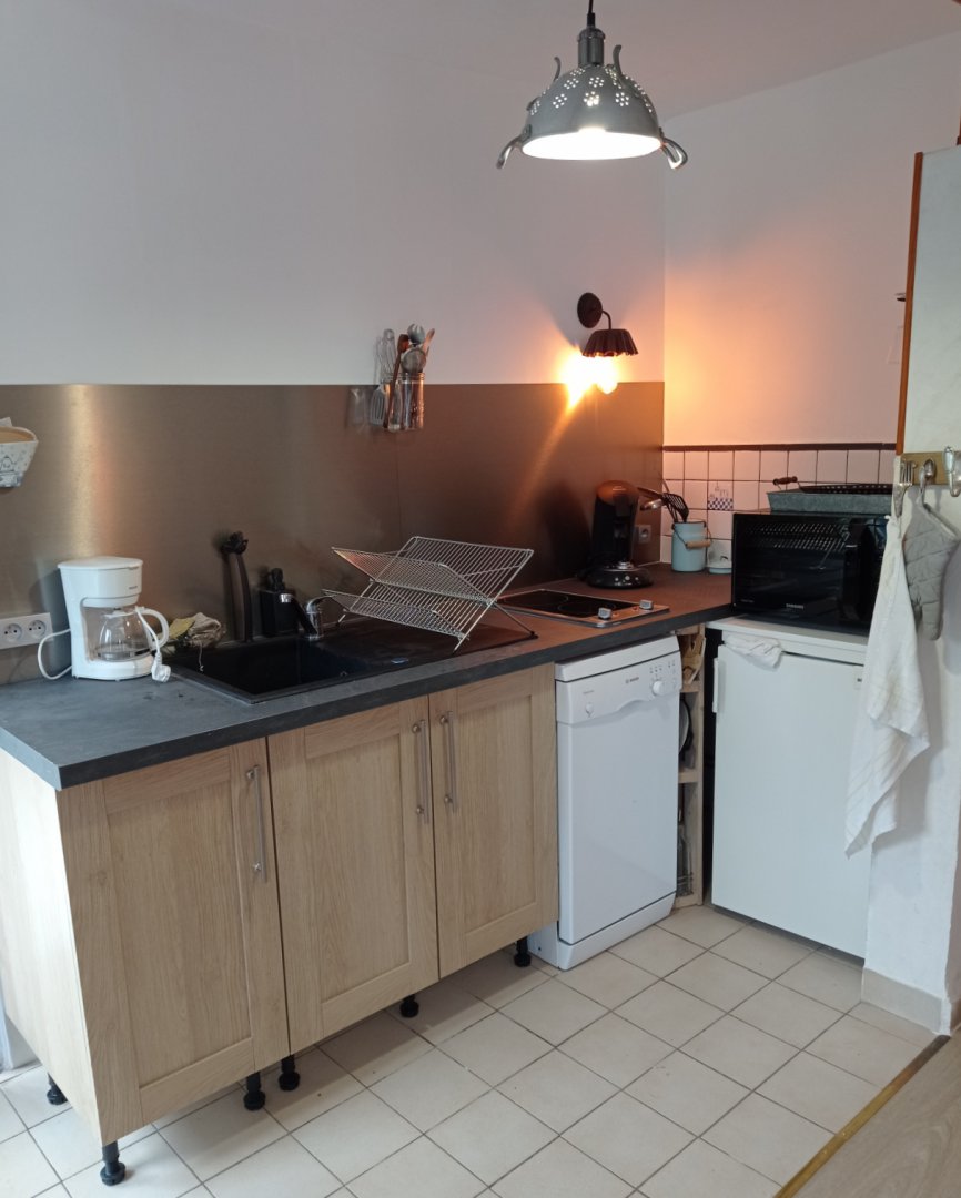 Une cuisine ouverte avec lave-vaisselle, 2 plaques vitrocéramiques, un petit réfrigérateur congélateur, un micro-ondes qui fait fonction de four, cafetière classique et Senseo, casseroles et vaisselles à volonté.
