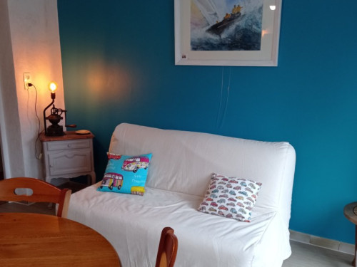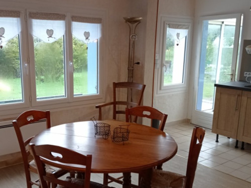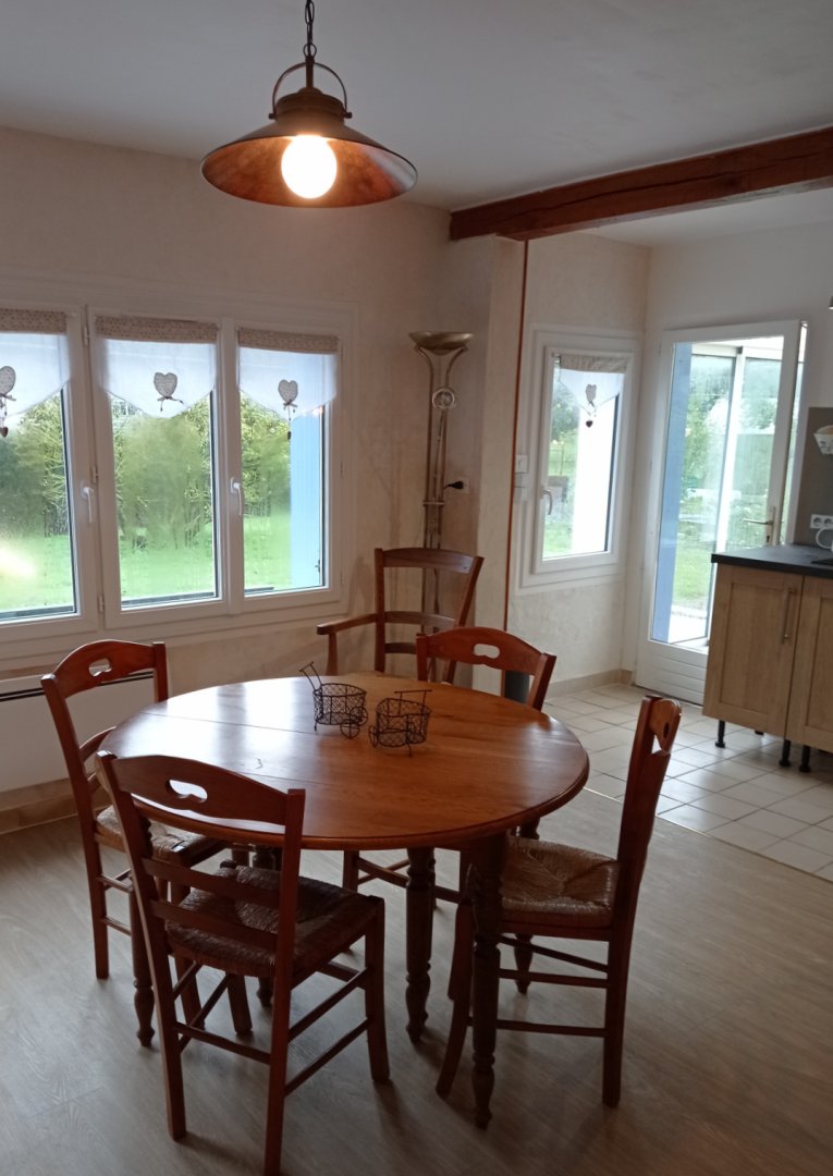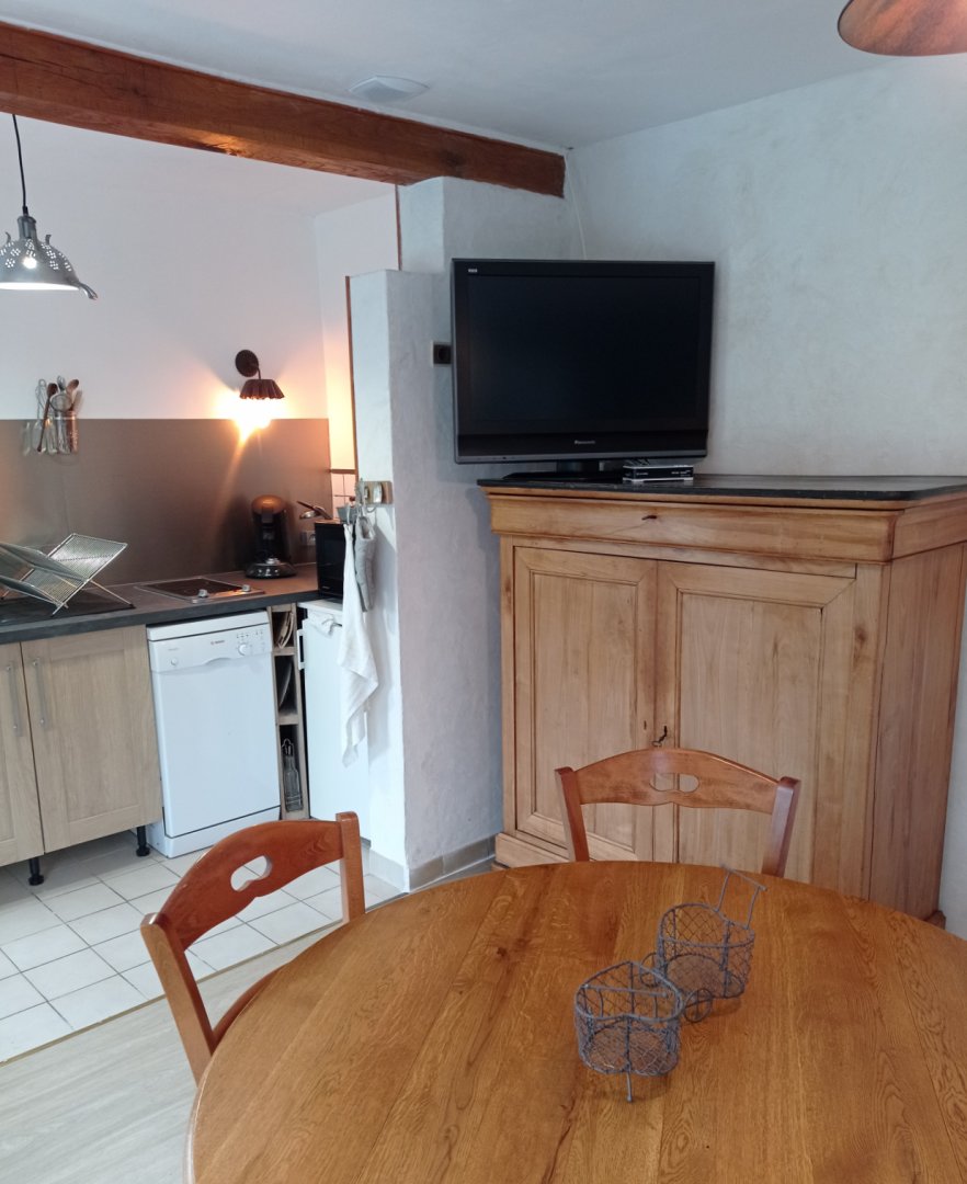Le séjour comprend une table ronde, 4 chaises, un canapé, un fauteuil, un meuble, téléviseur, WiFi.