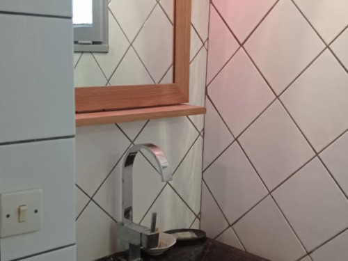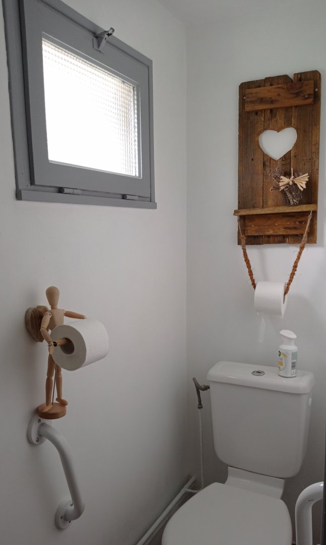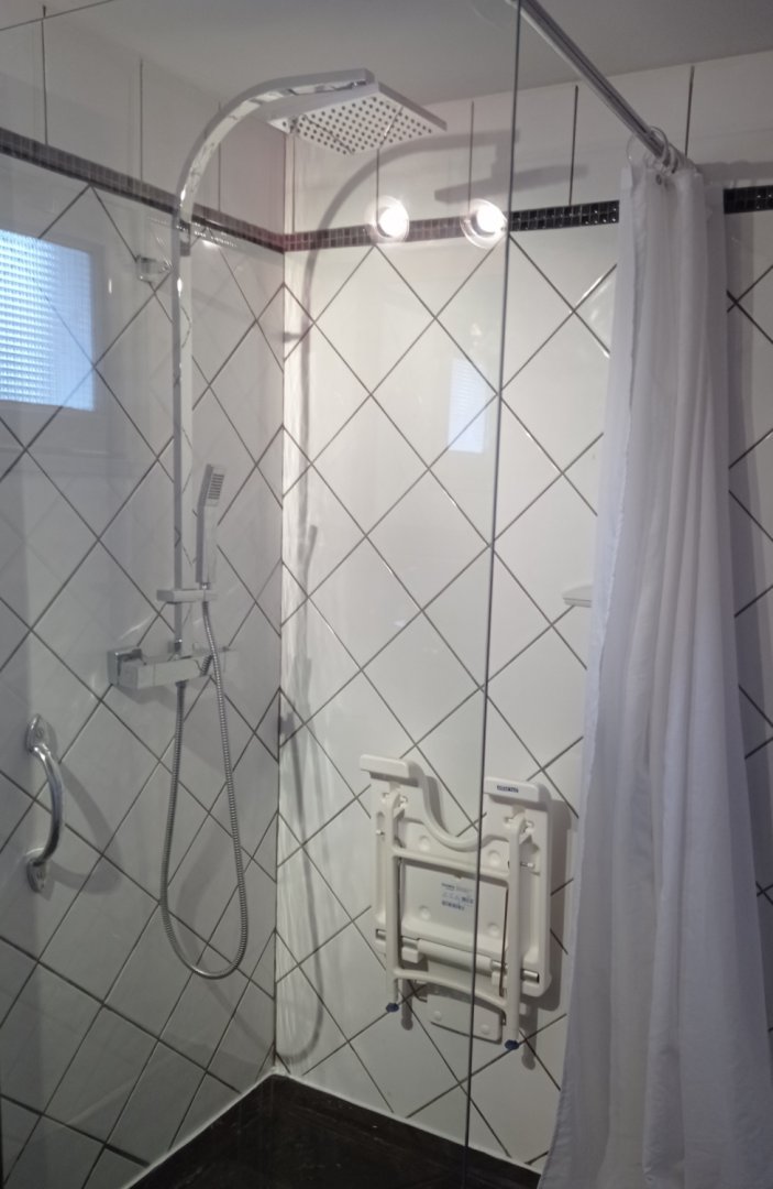 Une salle d'eau avec douche équipée d'un siège et barres, sèche-serviettes lavabo, WC indépendant