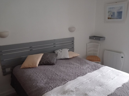 Une chambre pour 2 personnes lit 140x190 avec couvertures, meuble bas et 2 chaises.
