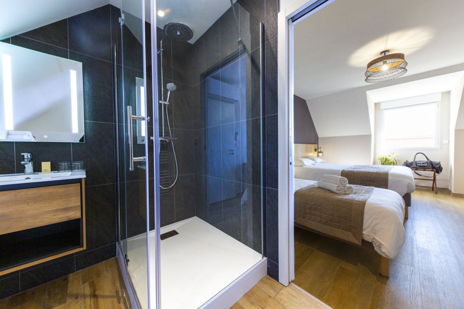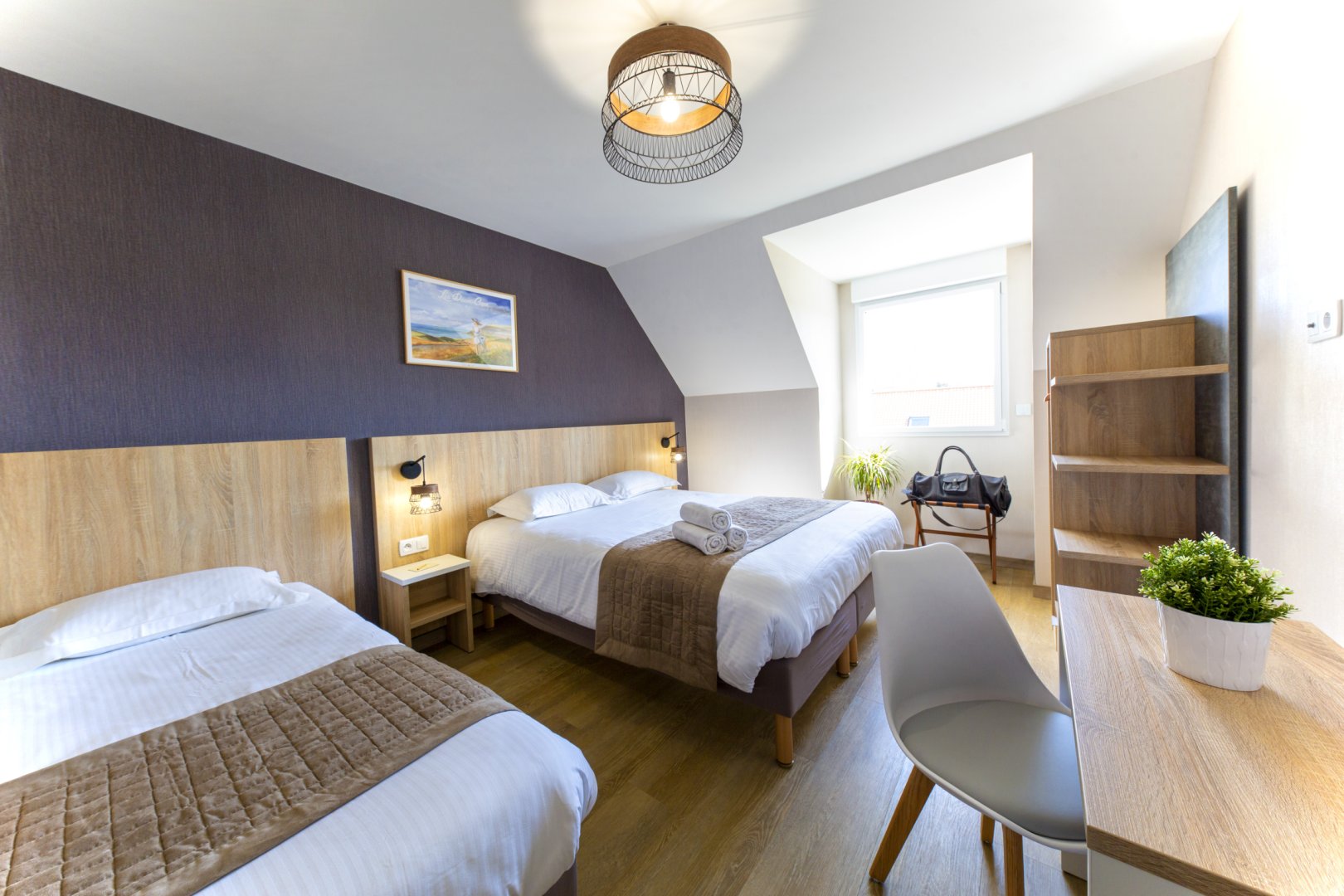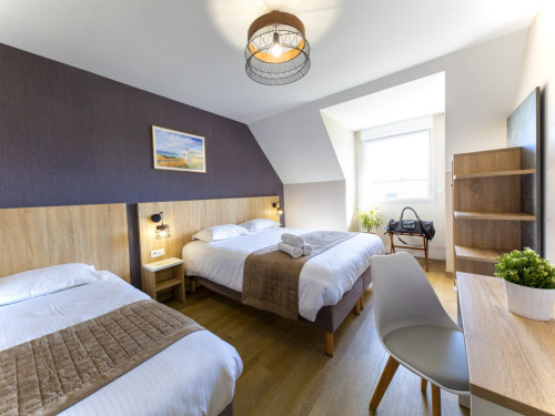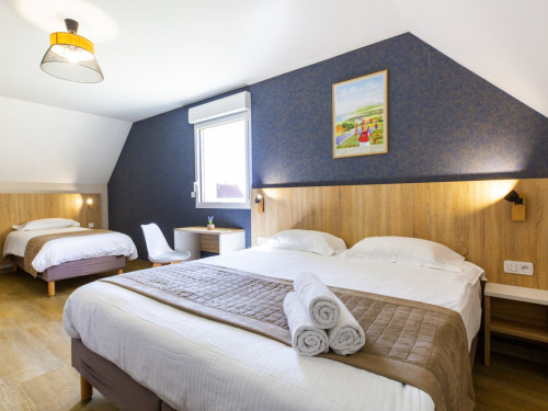 Chambre 3, 3 personnes : chambre au 1er étage, avec 1 lit de 160 cm et 1 canapé lit de 90 cm de qualité hôtelière. TV écran plat, rangements, salle de bain privative avec douche et WC. Chambre climatisée.