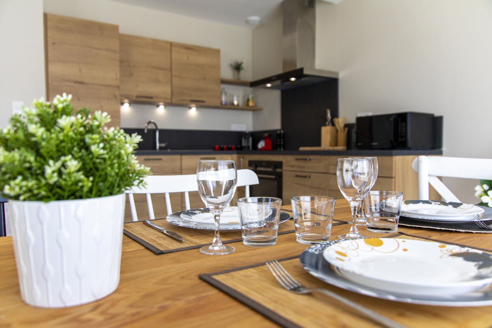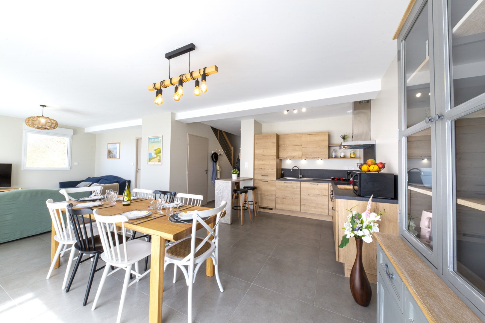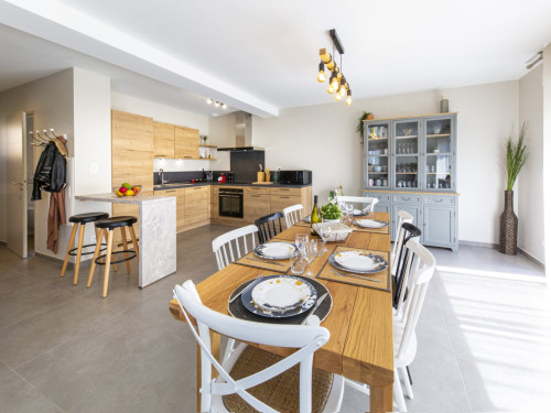 Cuisine : cuisine ouverte tout équipée comprenant réfrigérateur-congélateur, four à chaleur tournante, micro-ondes, plaques induction 4 feux avec hotte aspirante, machine à café, bouilloire, …
