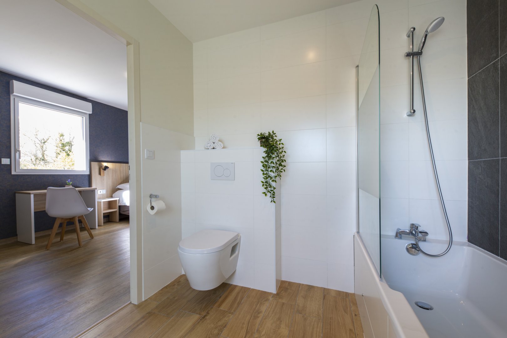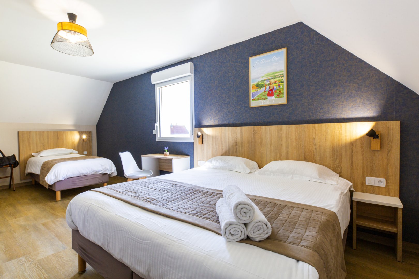 Chambre 2, 3 personnes : chambre au 1er étage, avec 1 lit de 160 cm et 1 lit de 90 cm de qualité hôtelière. TV écran plat, rangements, salle de bain privative avec baignoire et WC. Chambre climatisée.