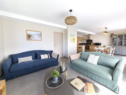 Salon-salle à manger : grande pièce à vivre, très lumineuse avec deux baie vitrées donnant sur le jardin. Beau salon avec TV écran plat, et tablée de 8 convives.