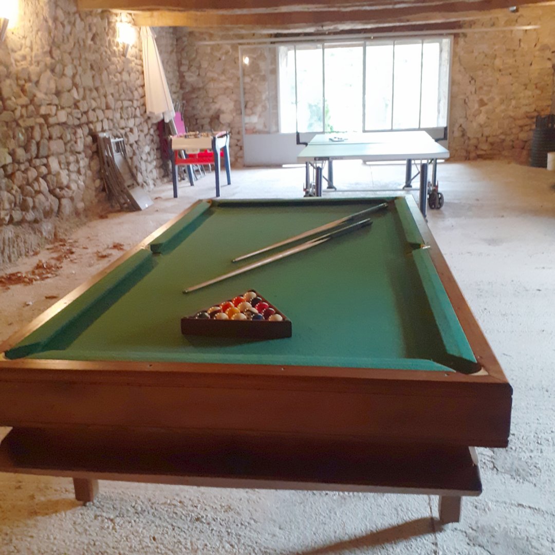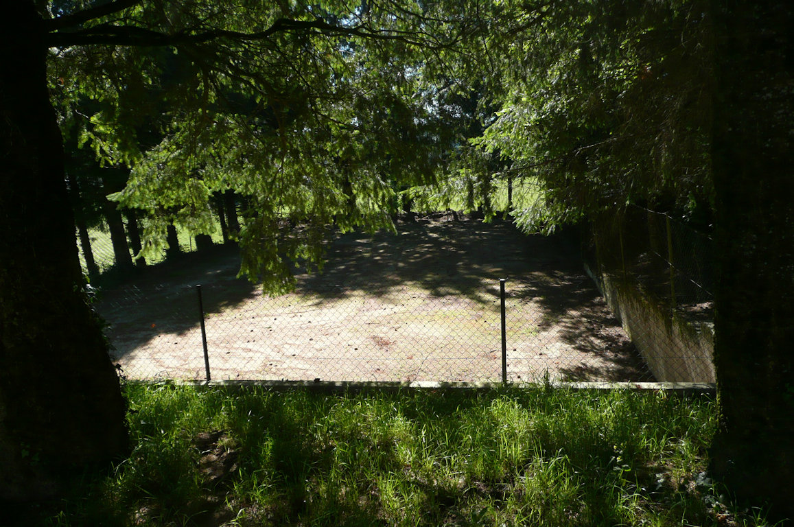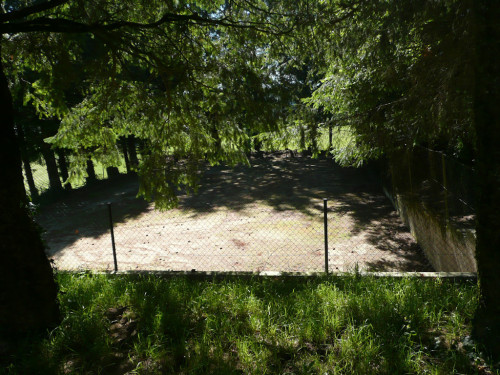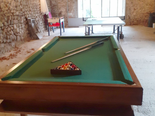 Grand terrain de jeux pour pétanque, ballon... Grand local couvert pour motos, voiture, vélos...