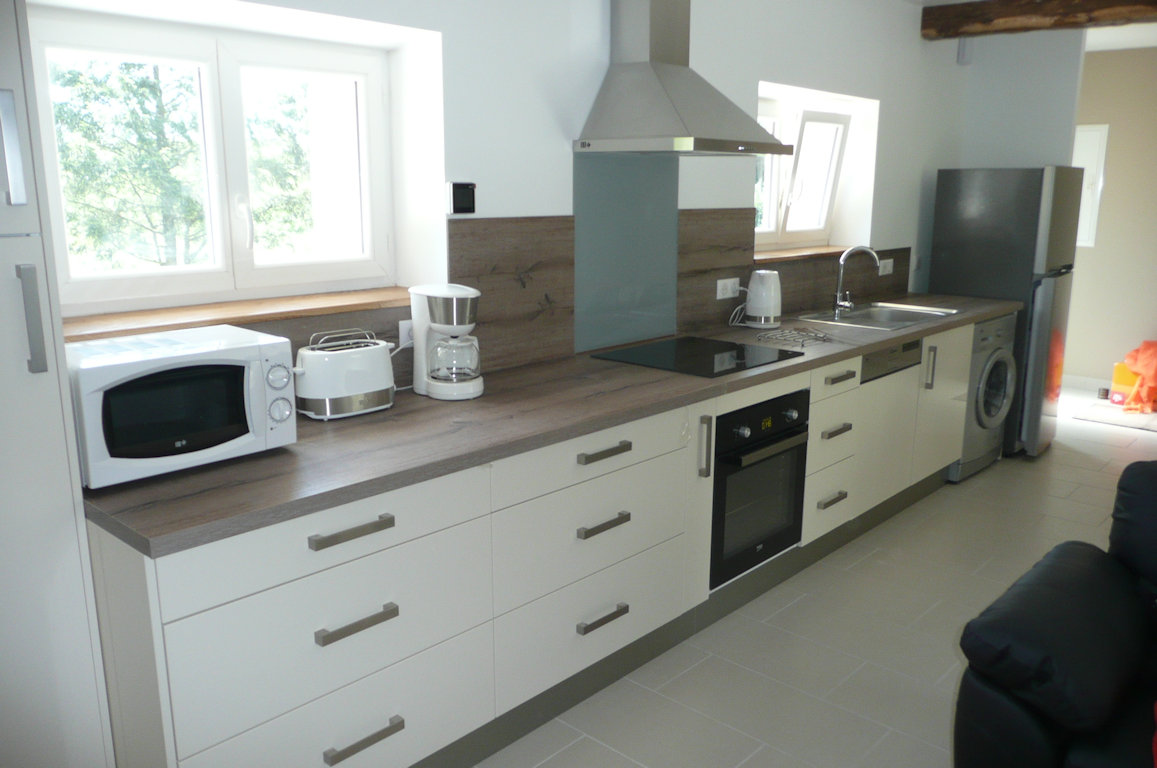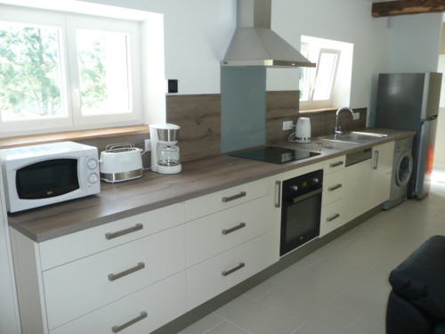 Grande pièce à vivre avec cuisine entièrement équipée : lave-linge, lave-vaisselle, four, plaque induction, frigo, congélateur, micro-ondes, cafetière, cafetière à dosettes, grille-pain, bouilloire, fer et table à repasser.