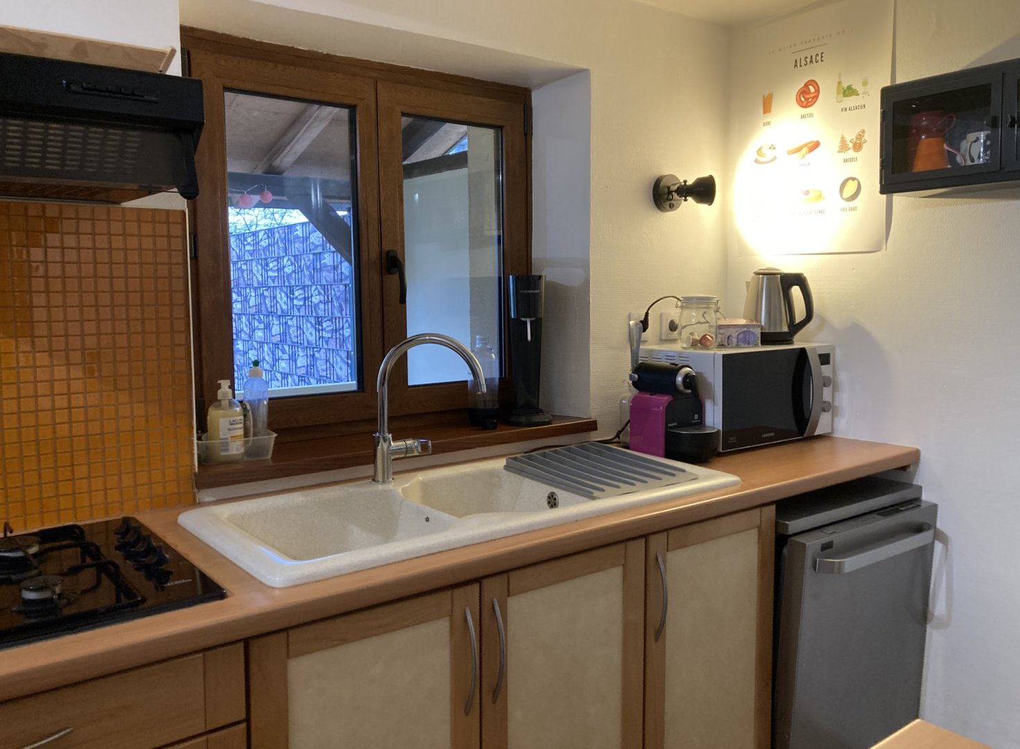 Cuisine équipée, Cafetière Nespresso, bouilloire, soda stream, micro-ondes, four, plaques, lave-vaisselle, lave-linge, frigo-congélateur, grille-pain.