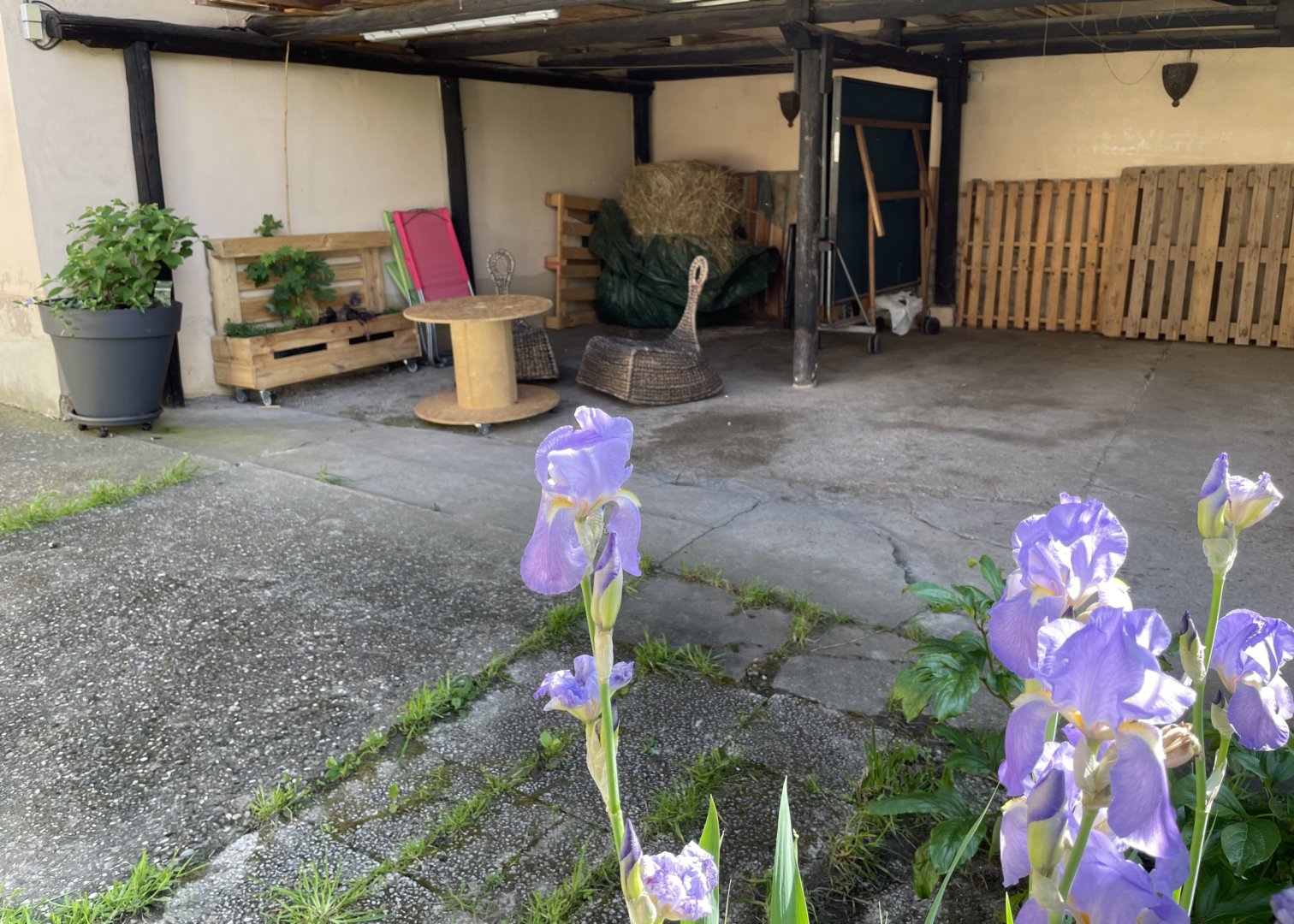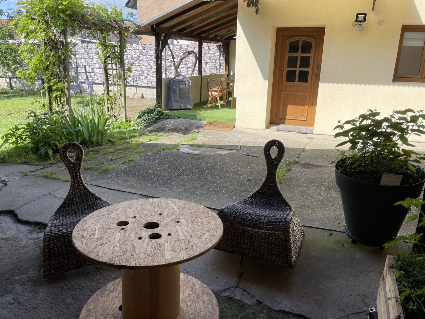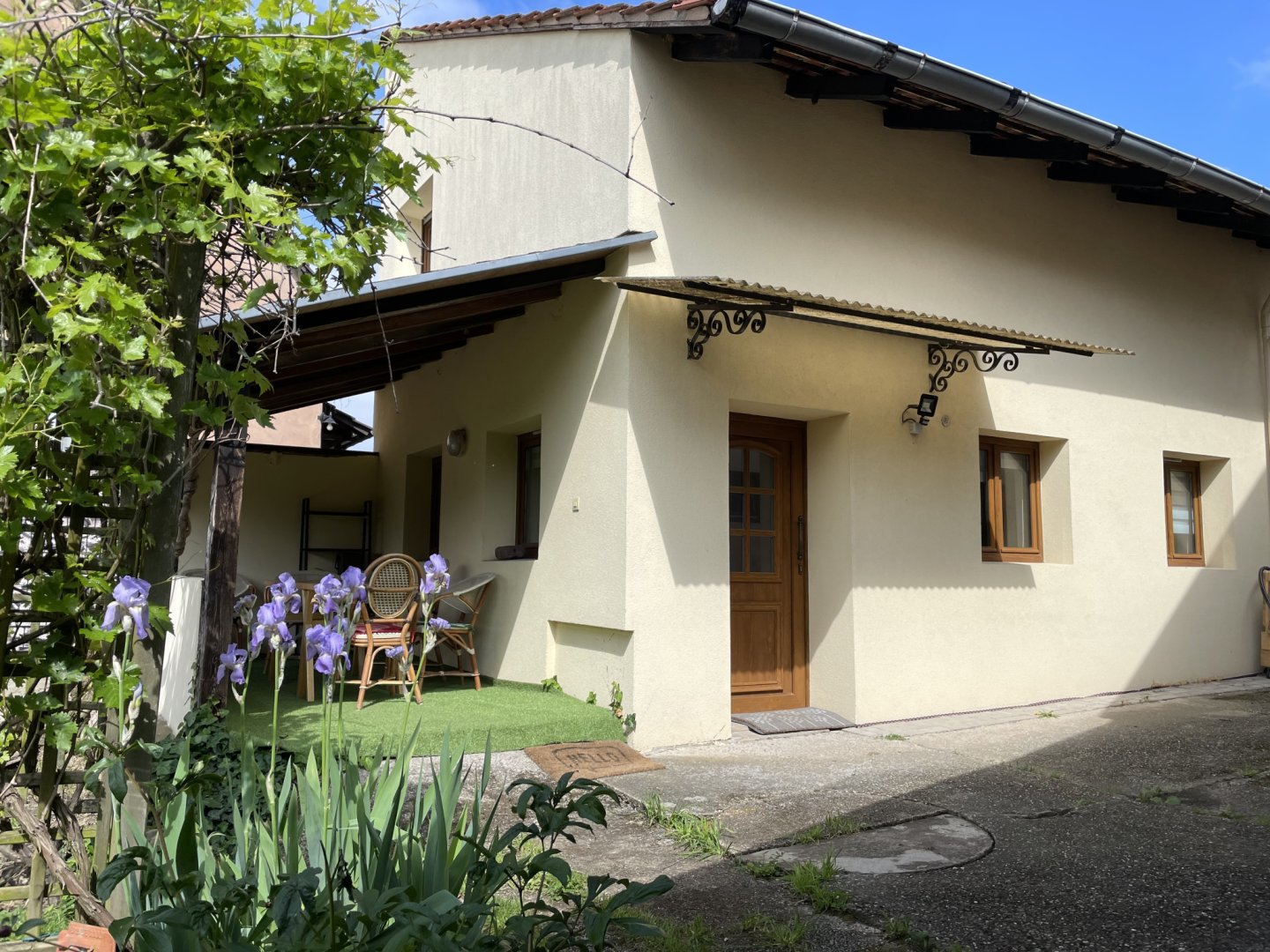 Terrasse en rez-de-jardin, barbecue, place de parking sous abri, table de ping-pong, accès au jardin.