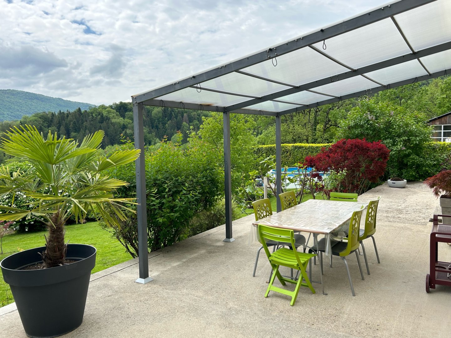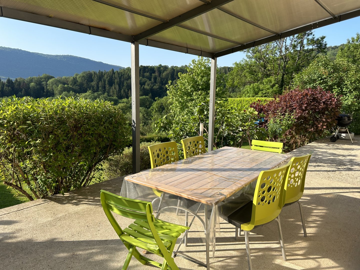 A l'extérieur, 2 grandes terrasse de chaque côté de la maison avec salon de jardin, parasol et barbecue, (la terrasse donnant sur le jardin et abritée en partie d'un pergola perméable)
