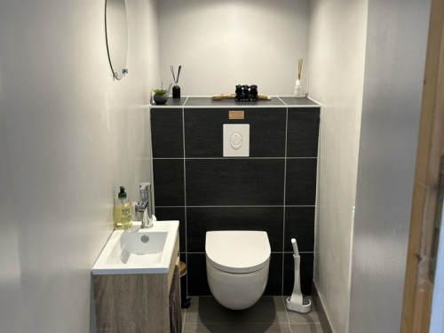 1 grande salle de bain avec douche, baignoire, vasque, WC