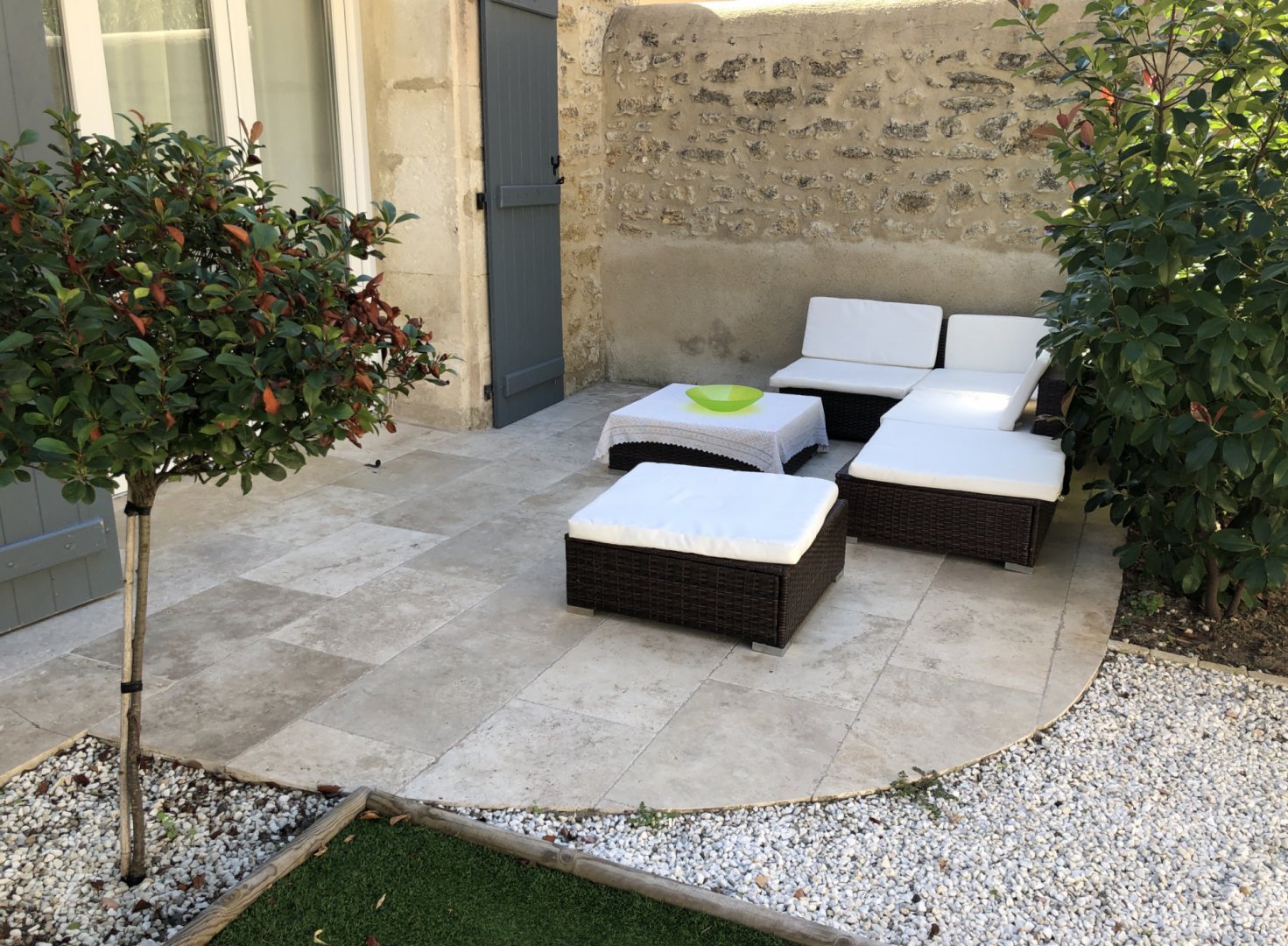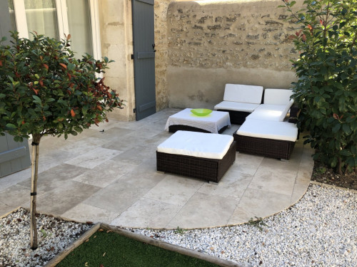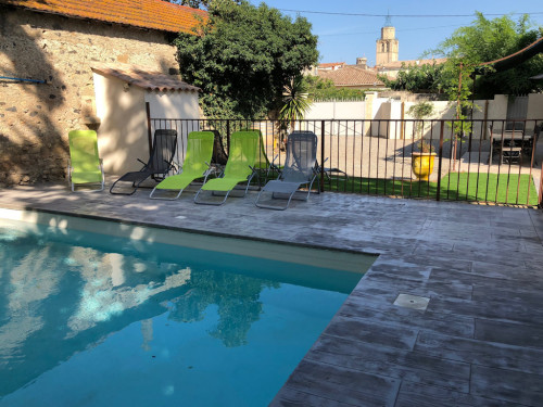 La cour : Une piscine privée pour cette maison et sécurisée pour vos enfants, des espaces de détente avec transats pour nos hôtes. Vous disposerez d'un barbecue et d'une table sous une pergola pour vos repas à l'extérieur.