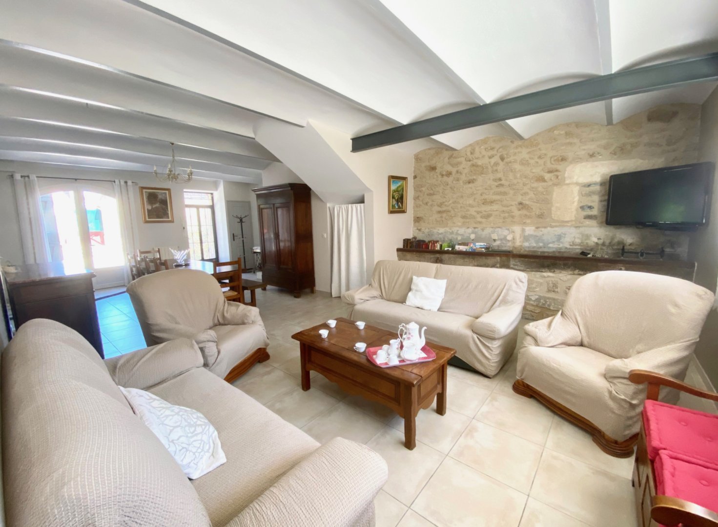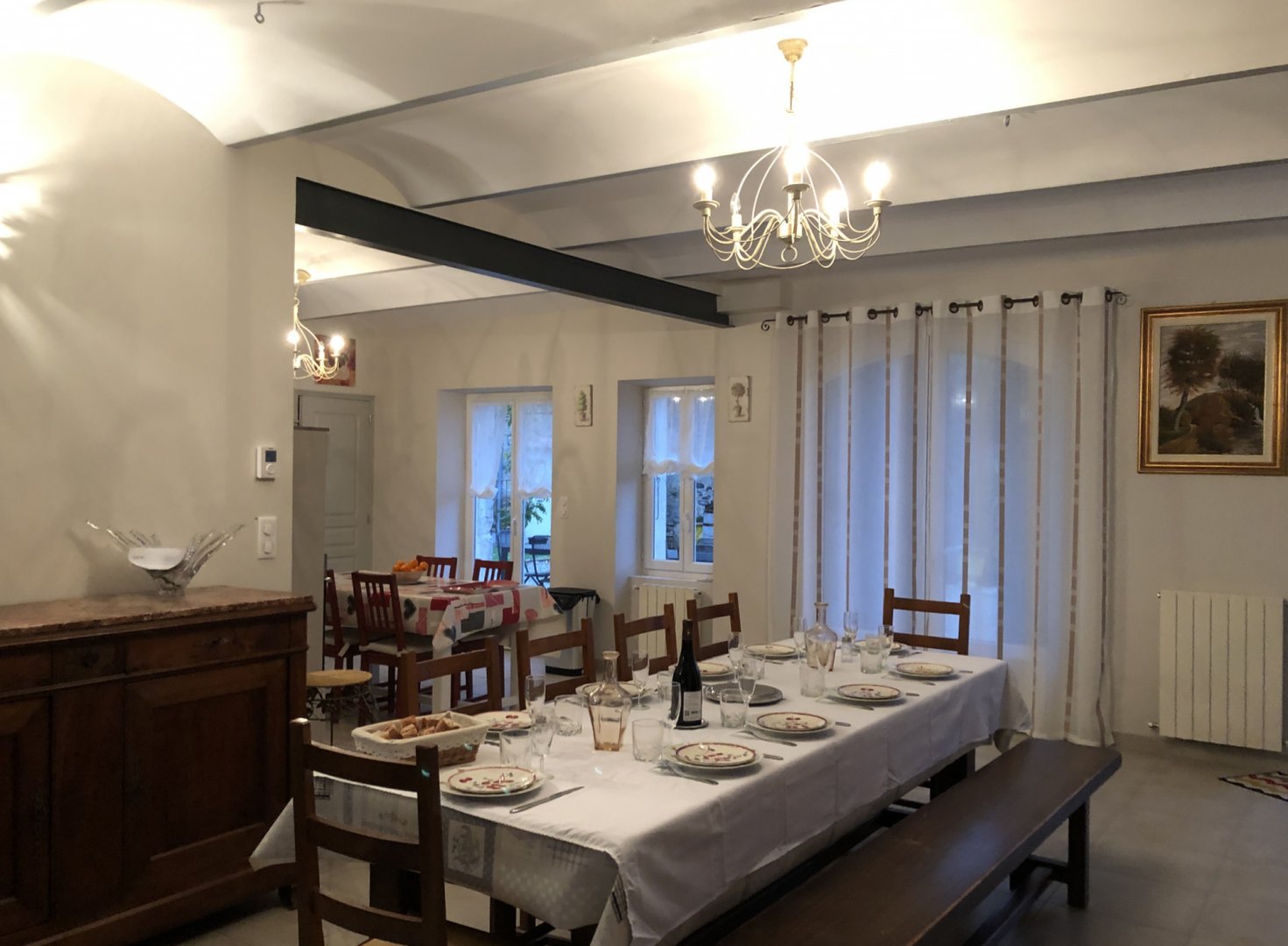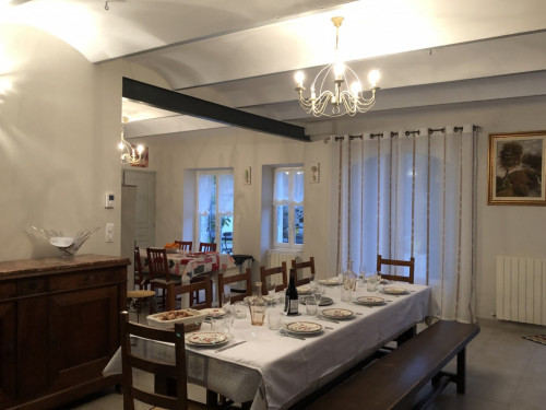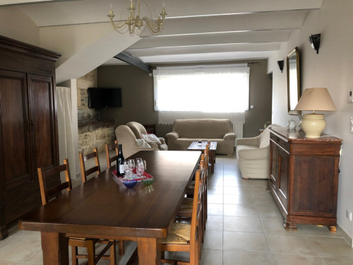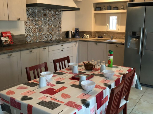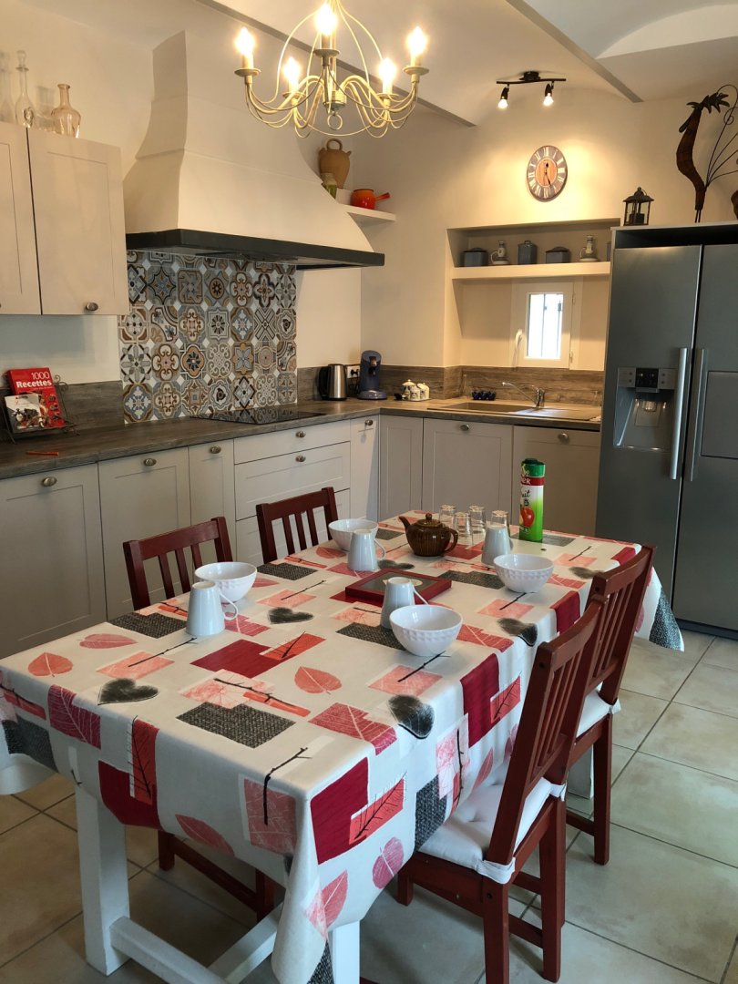 La maison comprend une grande pièce à vivre de 80 m² se composant d'un salon avec plusieurs fauteuils et canapés, une salle à manger spacieuse pour vos repas autour d'une grande table de ferme ouverte sur une cuisine contemporaine équipée (four, micro-onde, frigo américain, lave-vaisselle, lave-linge, cafetière, bouilloire...).