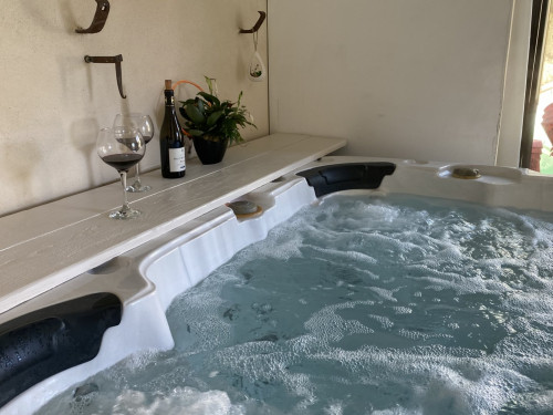 Dépendance : grand jacuzzi privé au gîte le Mas, pour des vacances relaxantes avec salon de jardin pour une pause café/thé, douche et wc. Stationnements de plusieurs véhicules dans la cour.