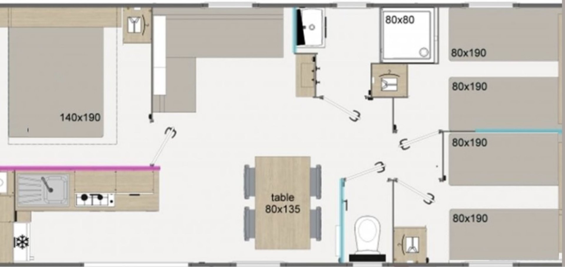 Ce logement dispose de 3 chambres dont 1 avec un lit 140x190 et 2 avec 2 lits 90x190, 1 salle d'eau et 1 wc séparé.