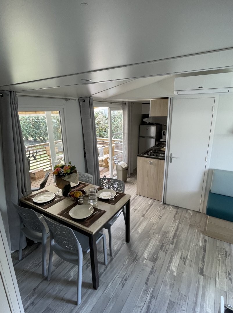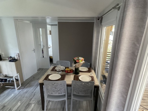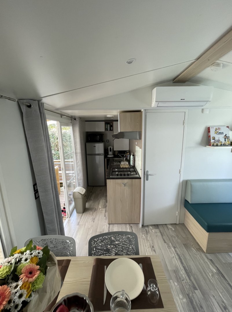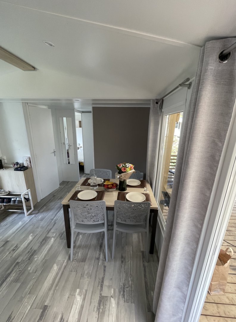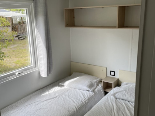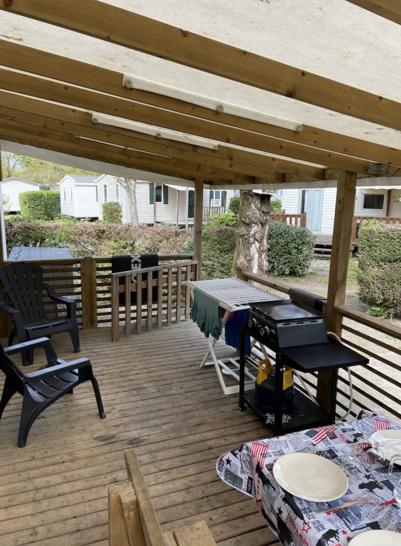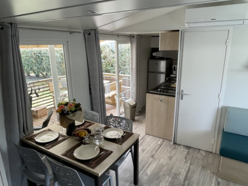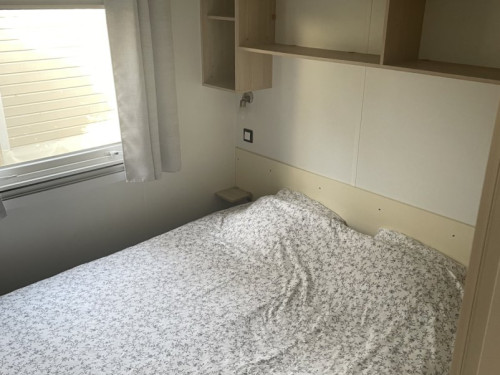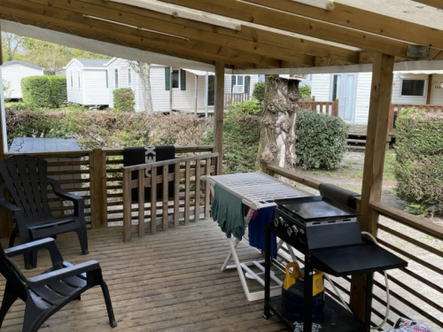 Loue mobil home (33 m²) climatisé, 3 chambres / 6 personnes (non fumeur), terrasse couverte, sur emplacement ombragé, sans vis-à-vis, dans un camping paisible et familial situé au bord du lac d'Aureilhan.