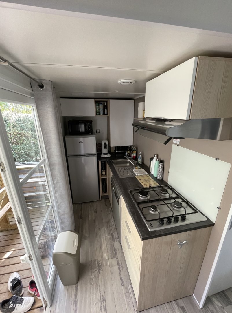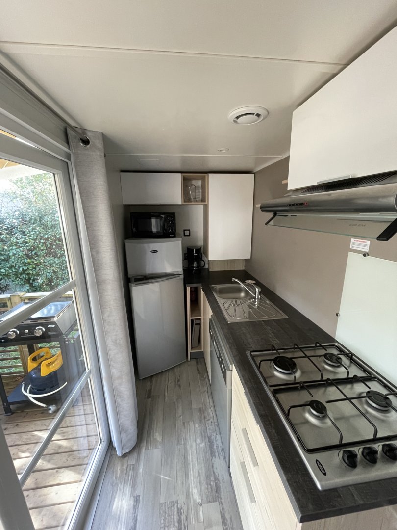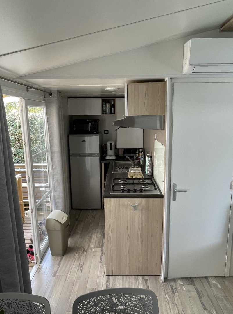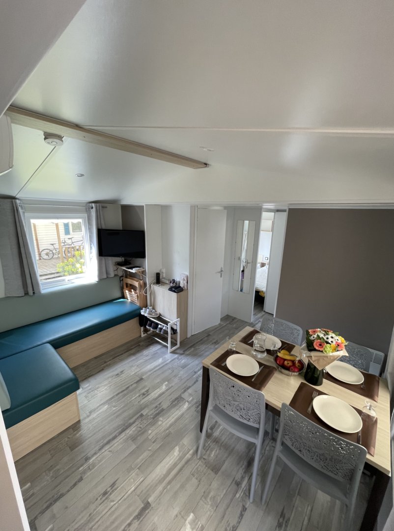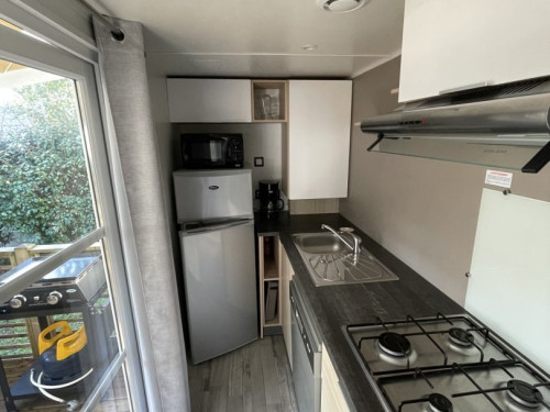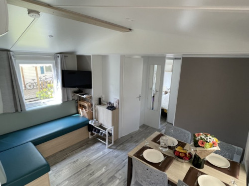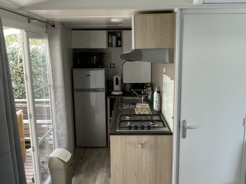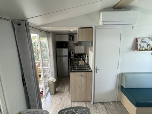 Loue mobil home (33 m²) climatisé, 3 chambres / 6 personnes (non fumeur), terrasse couverte, sur emplacement ombragé, sans vis-à-vis, dans un camping paisible et familial situé au bord du lac d'Aureilhan.