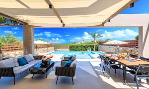 Die Unterkunft Minoas Villas Heated Pool bietet ihren Gästen einen Balkon, Bergblick, einen Sitzbereich, einen Satelliten Flachbild-TV, eine voll ausgestattete Küche mit einem Kühlschrank und einem Geschirrspüler sowie ein eigenes Badezimmer mit einer Dusche und kostenlosen Pflegeprodukten. Ein voll ausgestattetes eigenes Badezimmer mit einem Whirlpool und einem Haartrockner ist vorhanden.