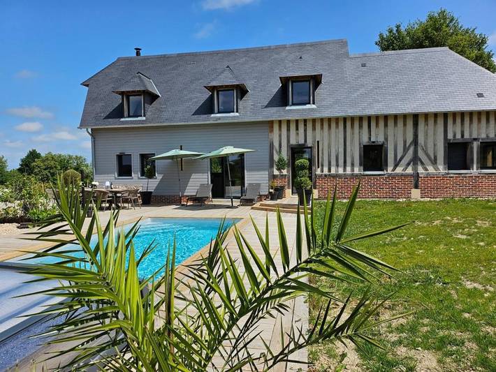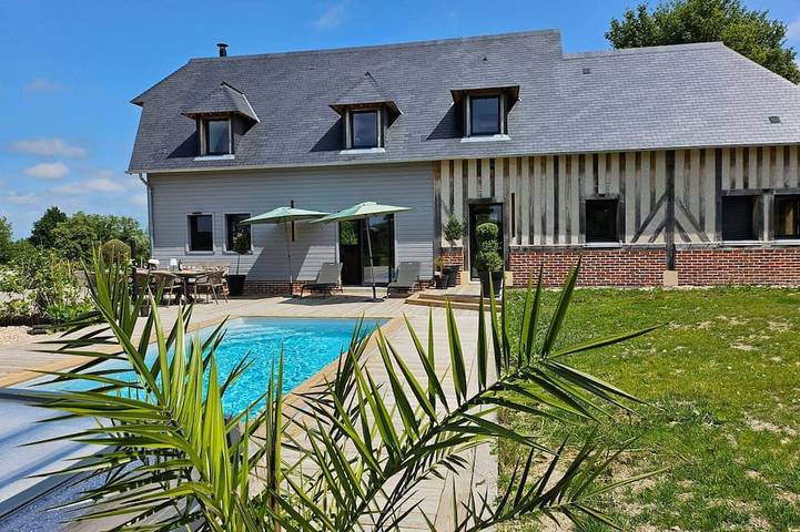 MyPacôme Conciergerie vous présente "Domaine de l'Orée du Bois " ! Entre Deauville et Lisieux, au cœur de la campagne normande à Norolles, cette superbe maison avec son terrain de 7 hectares privé dont 1 hectare de bois, allie le charme de l’ancien et le confort moderne. Nichée dans un écrin de verdure, elle offre une belle piscine creusée, chauffée et sécurisée, idéale pour se détendre. Parfaite pour les séjours en famille ou entre amis, la maison peut accueillir jusqu’à 6 adultes et 4 enfants. Dès l’entrée, vous découvrirez un bel espace doté de nombreux rangements, ouvrant sur une vaste pièce de vie baignée de lumière. Le séjour, sublimé par ses grandes fenêtres et baies vitrées, offre un accès direct sur la terrasse et la piscine. La cuisine américaine, conviviale et entièrement équipée (mixeur, plongeur, machine à croque-monsieur, bouilloire, cafetière…), dispose d’un îlot central parfait pour cuisiner ou partager un moment chaleureux. Le salon, à la fois cosy et authentique, est aménagé avec un grand canapé, une télévision et un poêle à bois. Un couloir dessert des toilettes indépendantes, une salle d’eau moderne (douche à l’italienne, sèche-serviette, sèche-cheveux et miroir à LED), ainsi qu’une buanderie équipée d’un lave-linge et d’un sèche-linge. Au fond du couloir, une première chambre avec lit king size bénéficie d’un accès direct à une seconde terrasse, propice à l