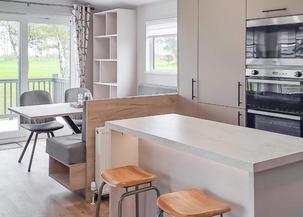 Une cuisine équipée d’un réfrigérateur, d’un four et d’une plaque de cuisson est également présente dans certains logements.