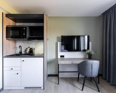 La kitchenette bien équipée est munie d’un réfrigérateur, de plaques de cuisson, d’un micro-ondes et d’ustensiles de cuisine. Ce studio climatisé dispose d’une télévision à écran plat avec services de streaming et d’une salle de bains privative. Ce logement comporte 1 lit.
