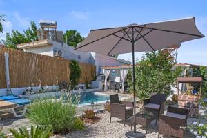 The holiday home with a patio and pool views has 2 bedrooms, a living room, a flat-screen TV, an equipped kitchen with an oven and a microwave, and 1 bathroom with a walk-in shower. Towels and bed linen are offered in the holiday home. The property has an outdoor dining area.