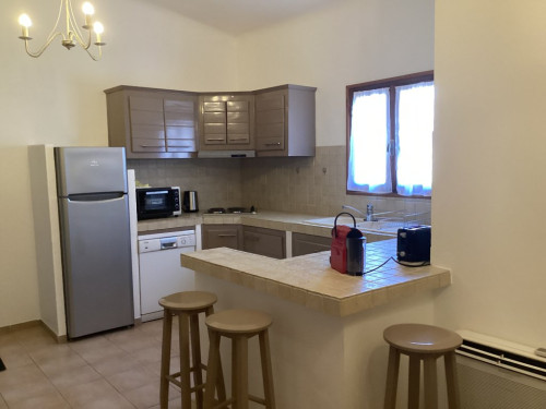 Sobre et épurée mêlant le bois et la pierre, la cuisine américaine séparée est fonctionnelle et entièrement équipée: lave-linge, lave-vaisselle, four, micro-onde, cafetière, bouilloire, grille pain, batterie de cuisine…