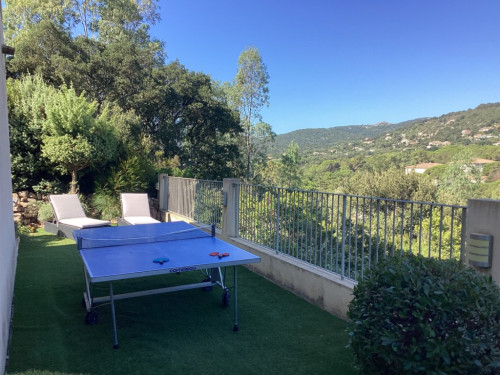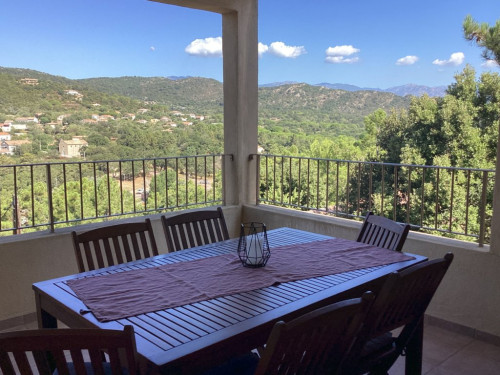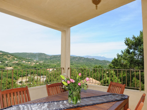 La terrasse couverte offre une somptueuse vue panoramique sur les montagnes , avec son salon de jardin en teck tout confort et ses chaises longues pour mieux vous évader dans le paysage qui vous entoure.