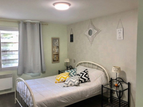 Un séjour salon avec canapé lit (2 personnes), une cuisine aménagée et équipée, un salle de bain avec douche à l'italienne (barres d'appui, siège de douche, toilettes rehaussées), et une chambre avec un lit de 2 personnes (barreaux)