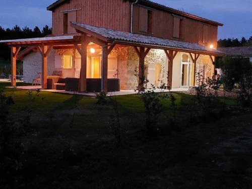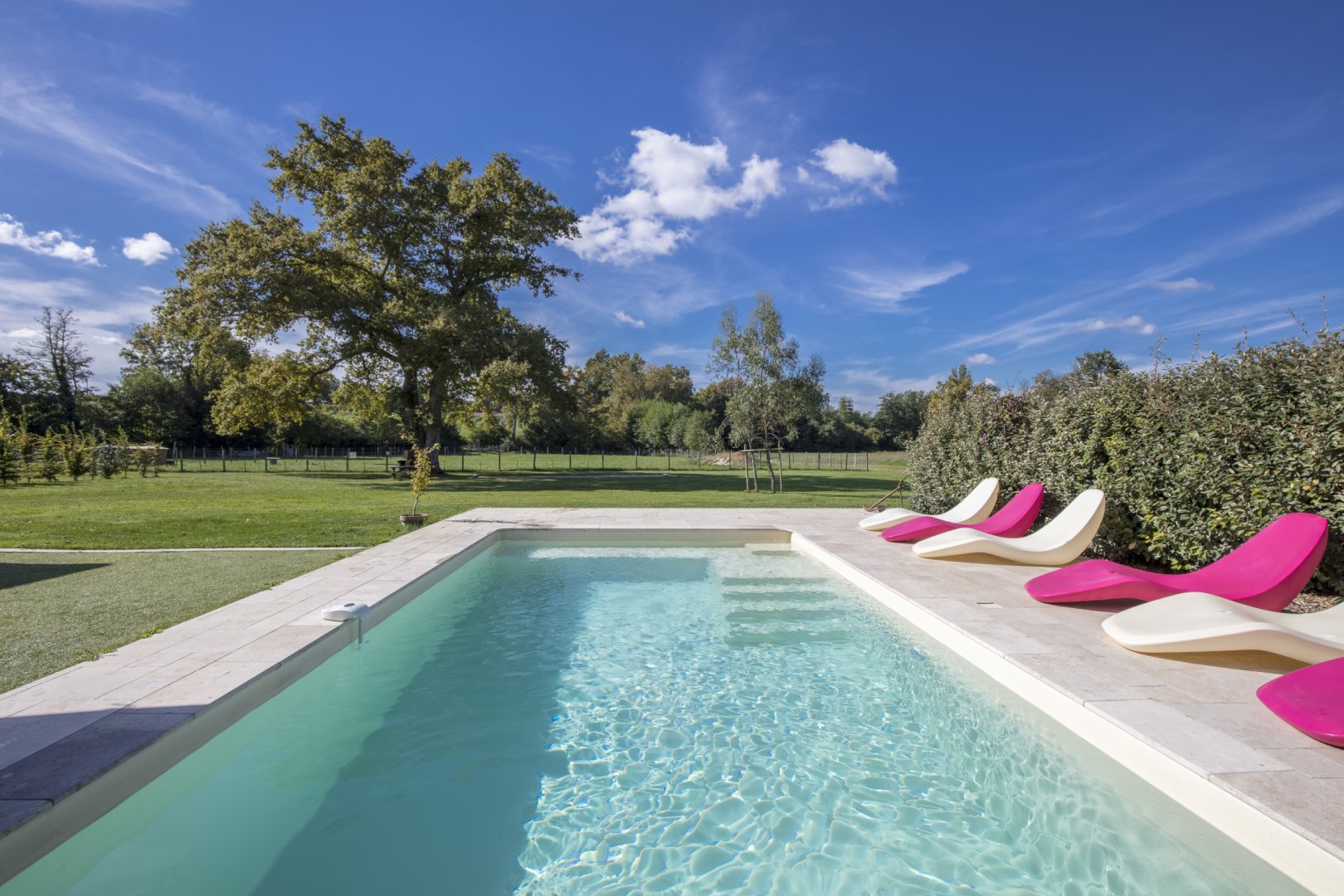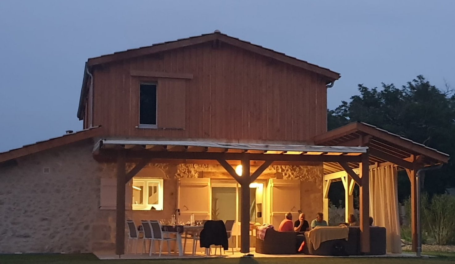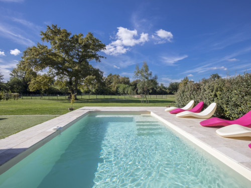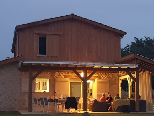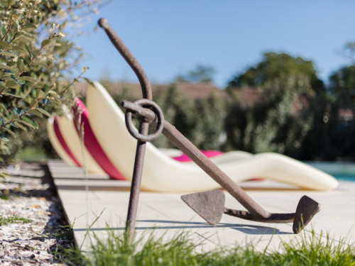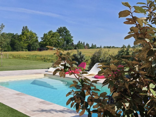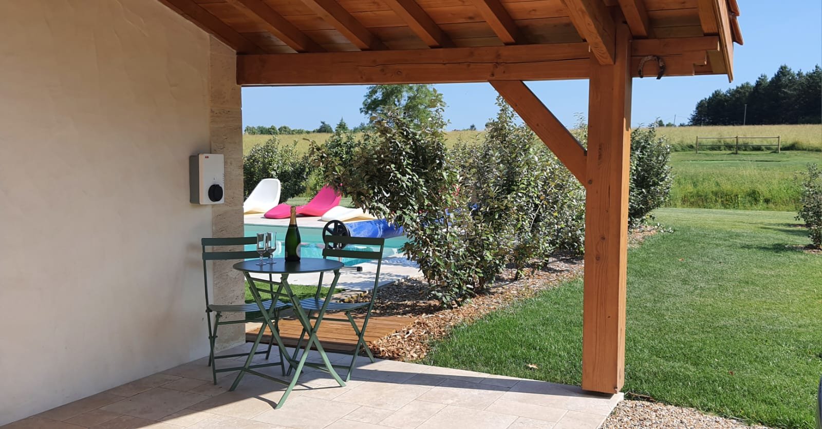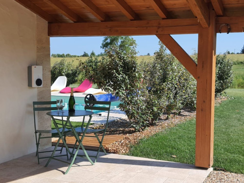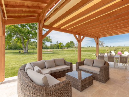 La terrasse couverte et ombragée avec vue sur la piscine privative (4 x 8 m), la nature environnante et le terrain de boules, est aménagée d’un salon d'été où vous pourrez vous détendre, d'une grande table aux fauteuils confortables et d'un brasero, plancha, barbecue.