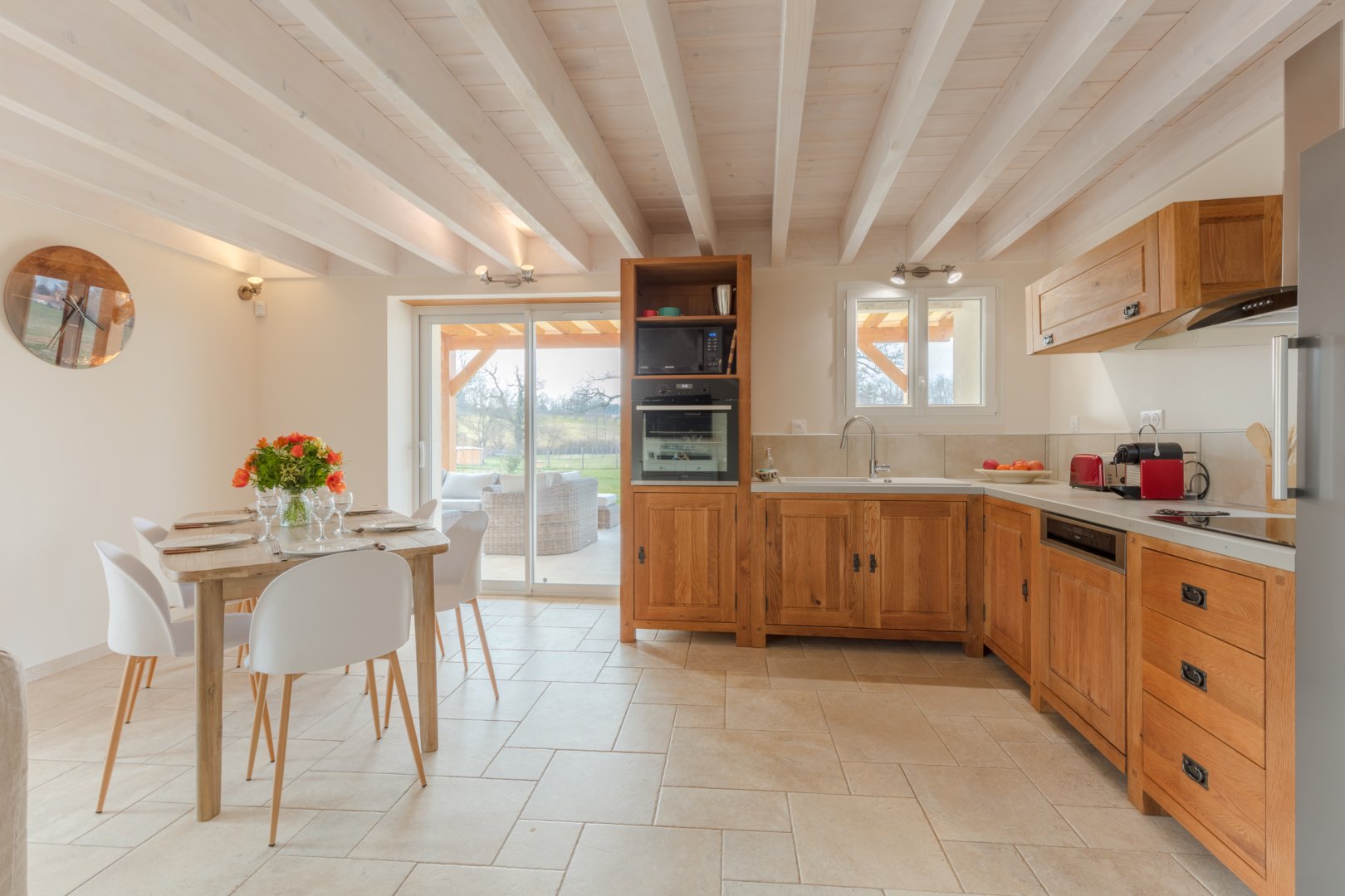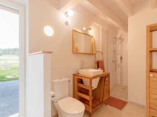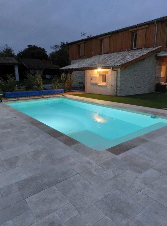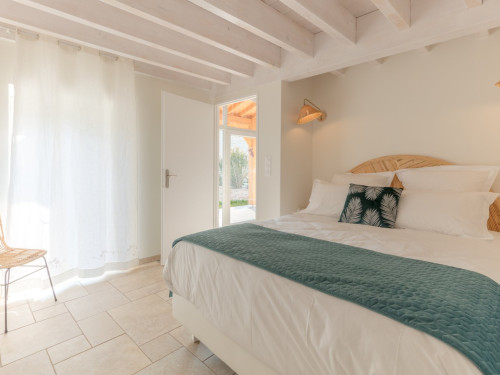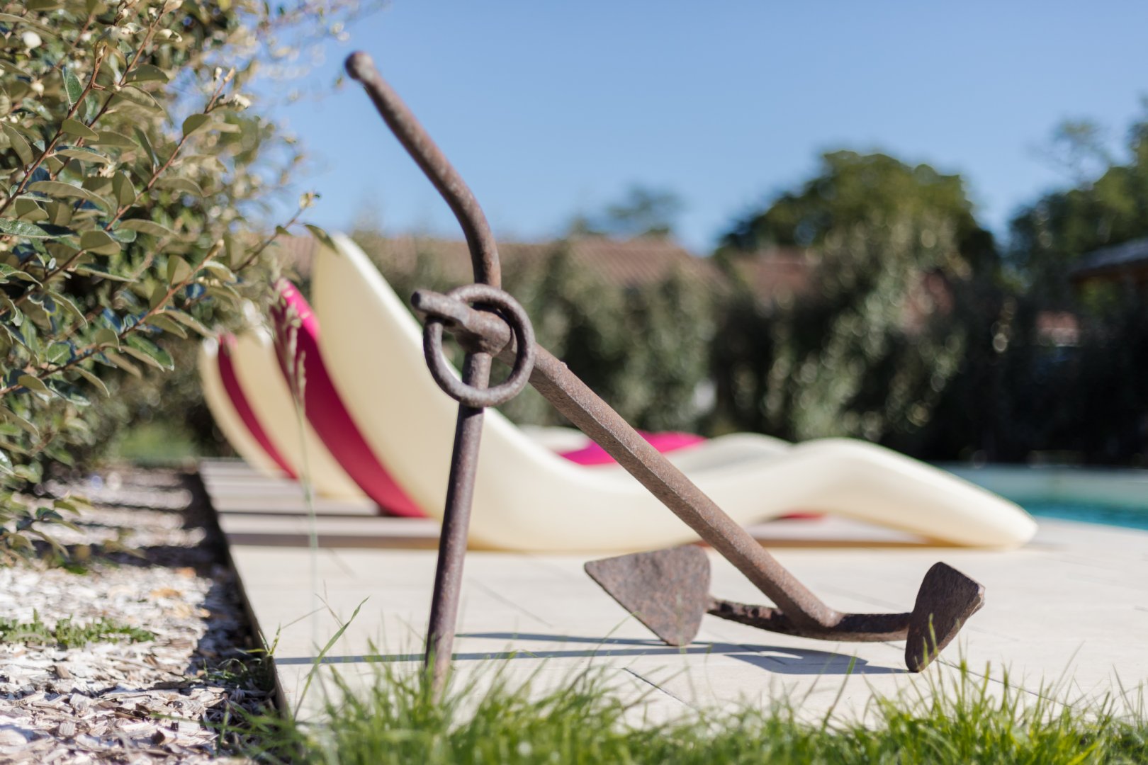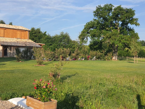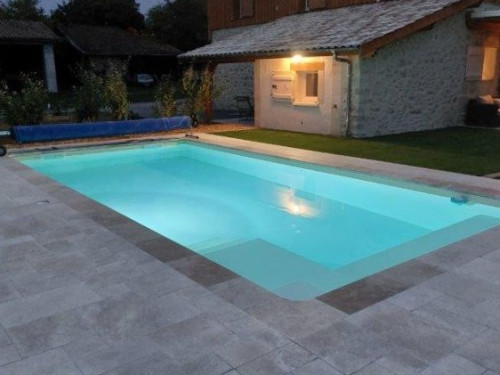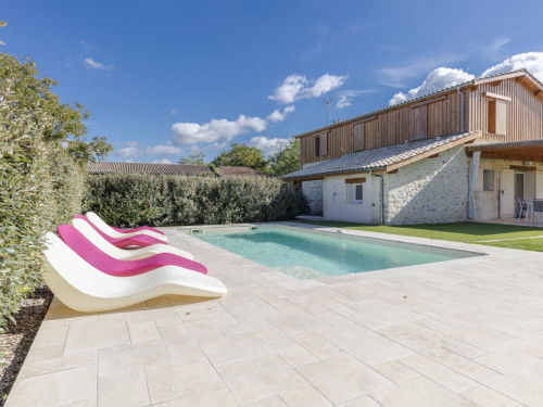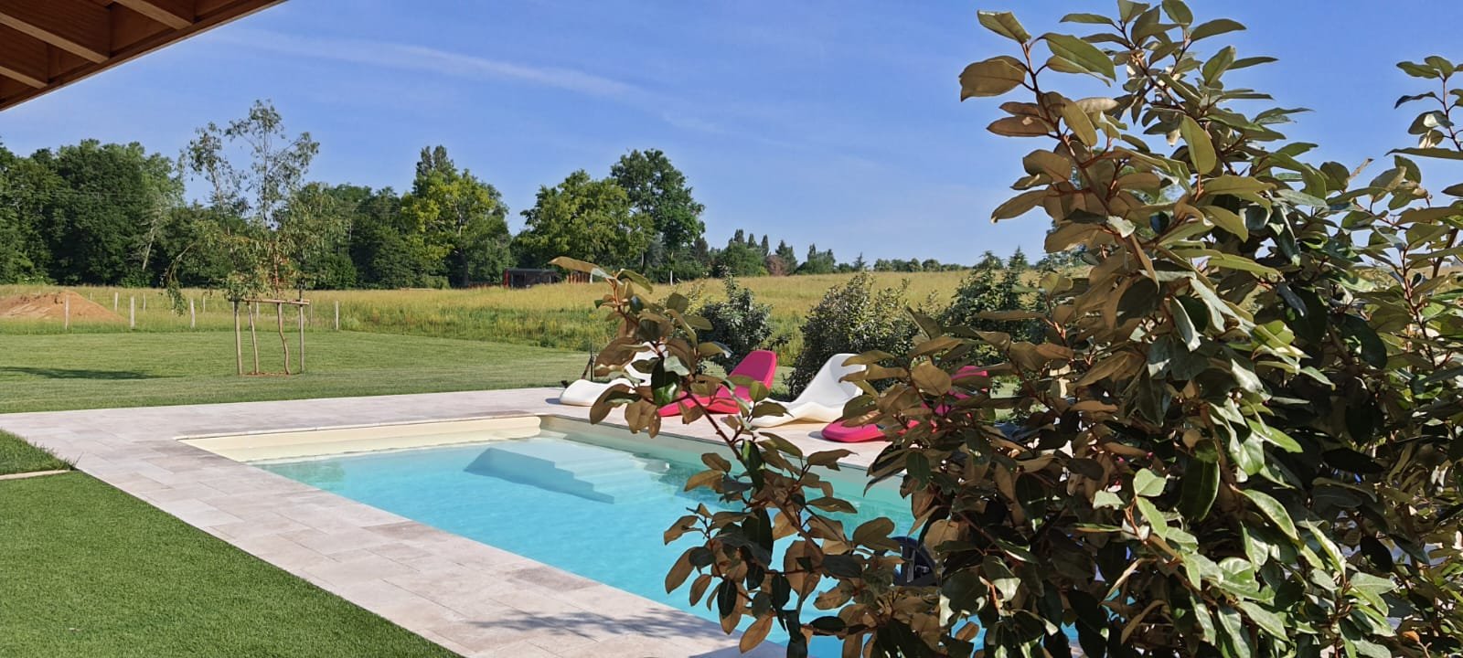 La terrasse couverte et ombragée avec vue sur la piscine privative (4 x 8 m), la nature environnante et le terrain de boules, est aménagée d’un salon d'été où vous pourrez vous détendre, d'une grande table aux fauteuils confortables et d'un brasero, plancha, barbecue.