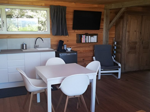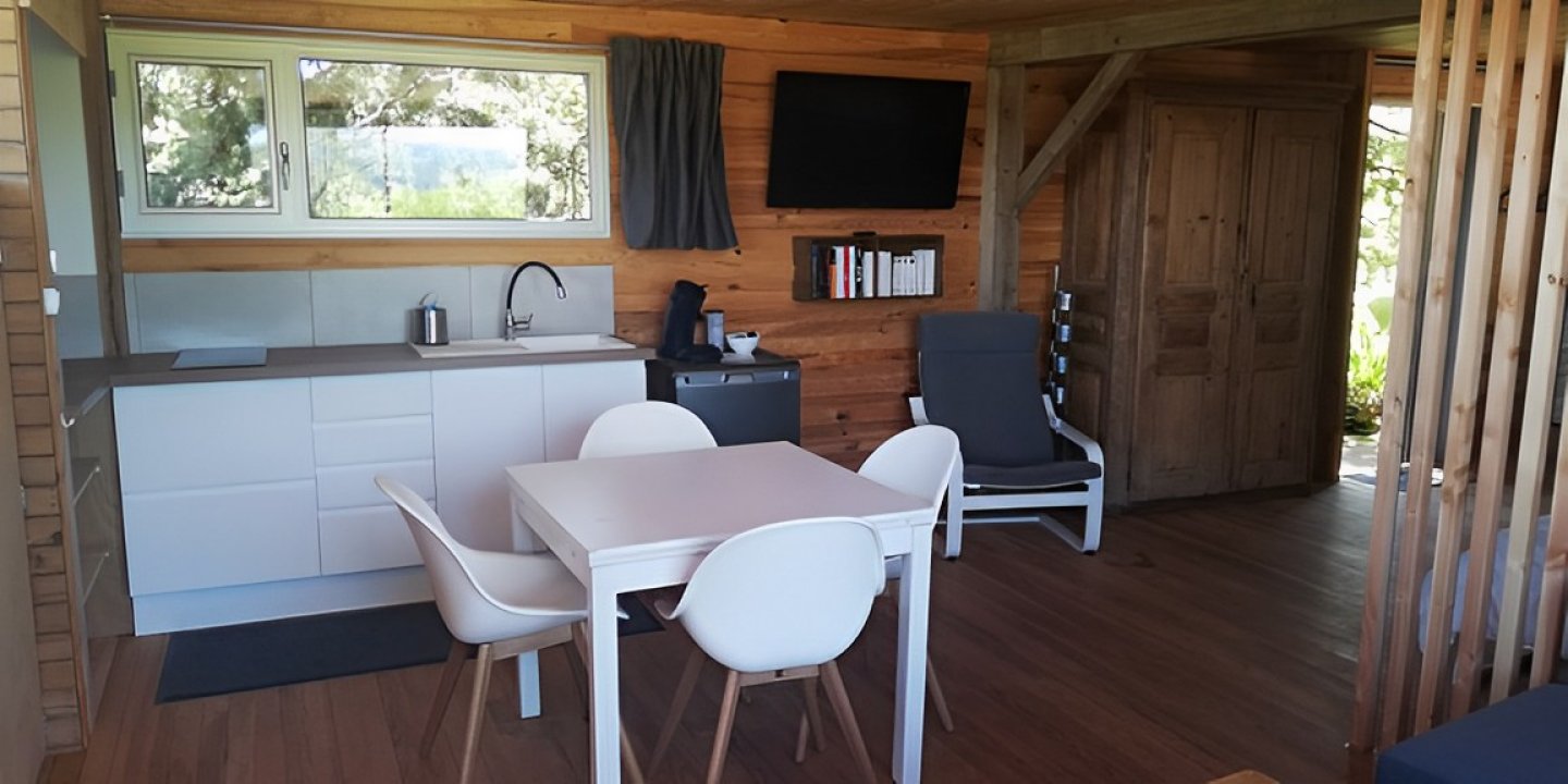 Chaque gîte est équipé d'une kitchenette, d'une salle de bain et de la TV :
