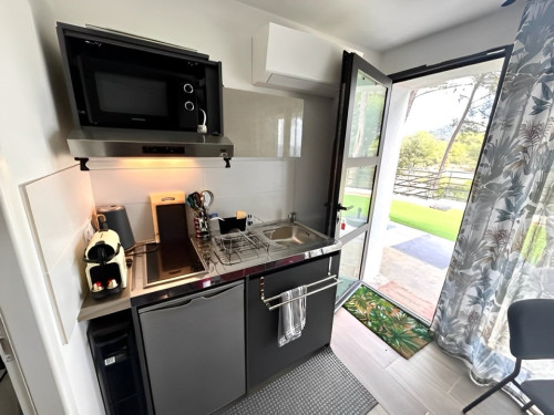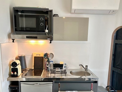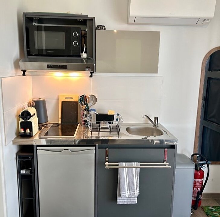 Kitchenette frigo, 2 plaques de cuisson, hotte aspirante, machine à café Nespresso ET cafetière filtre, grille-pain, four micro-ondes