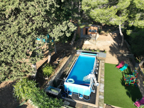 Accès par un escalier à une grande piscine partagée de 7 x 2,8 m, profondeur 1,20 m. Bâche et échelle de sécurité