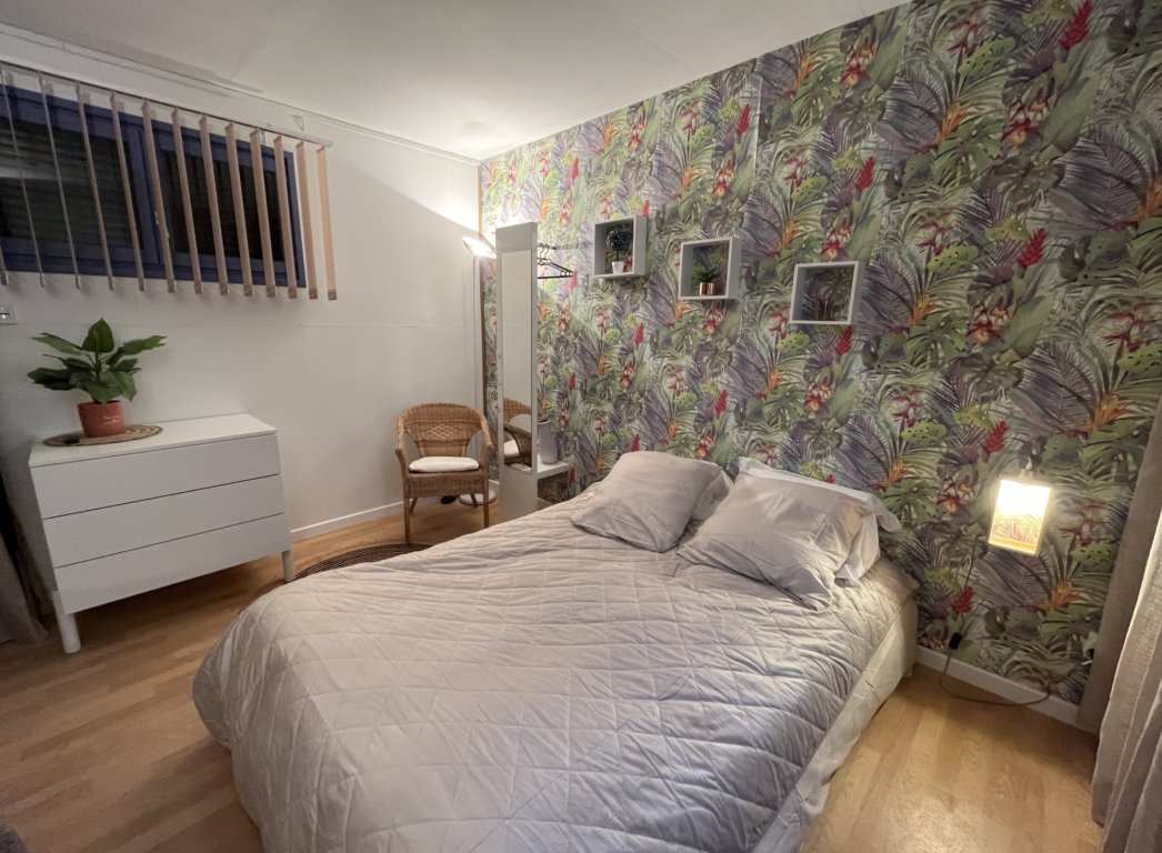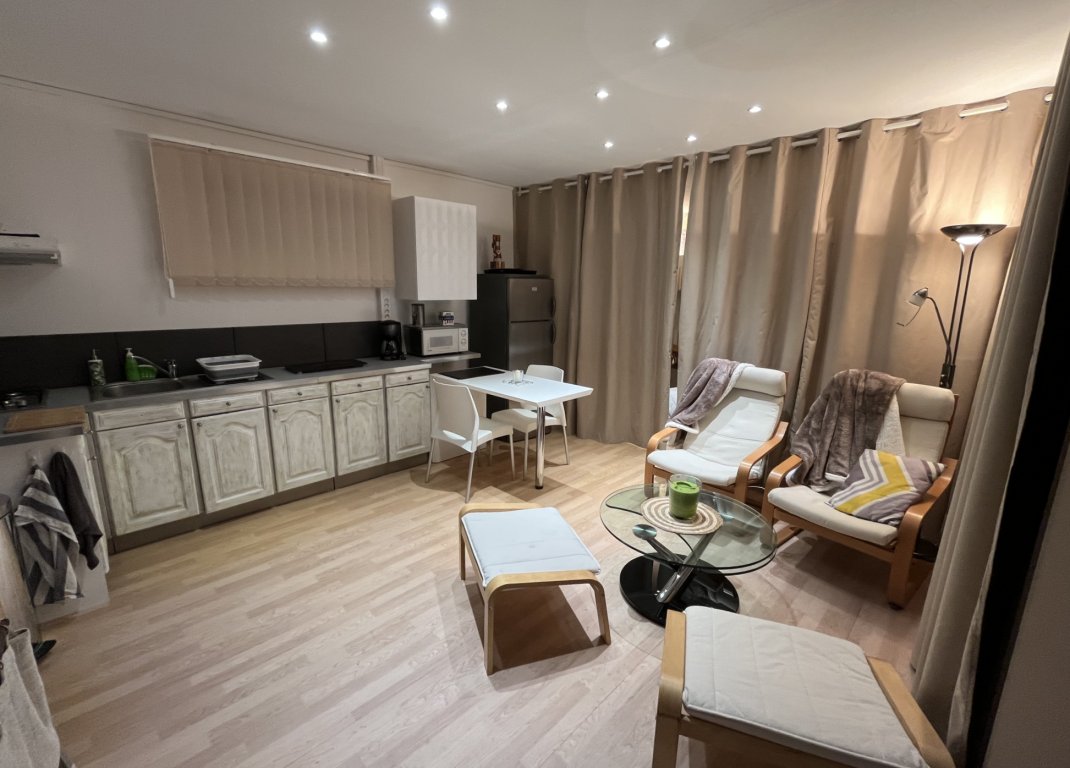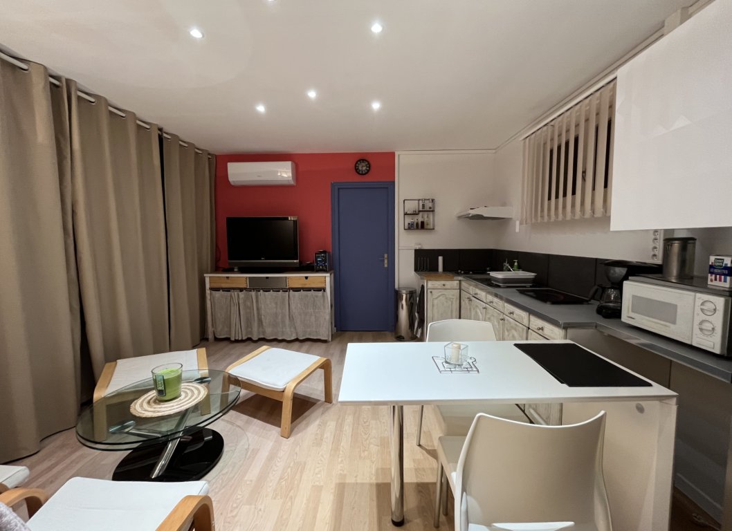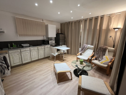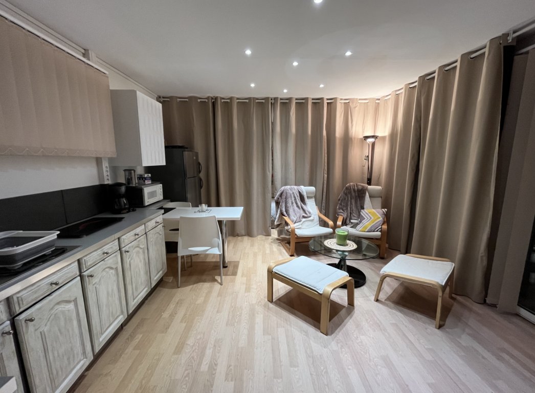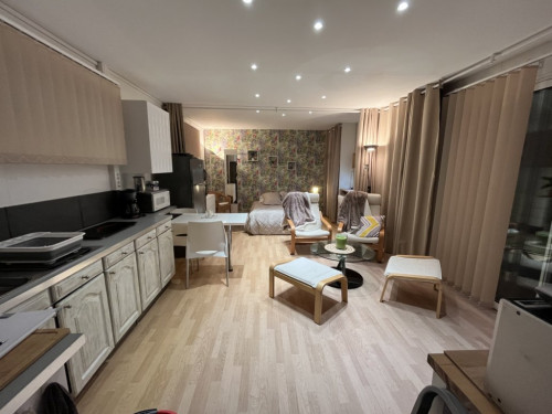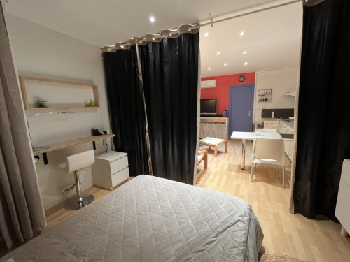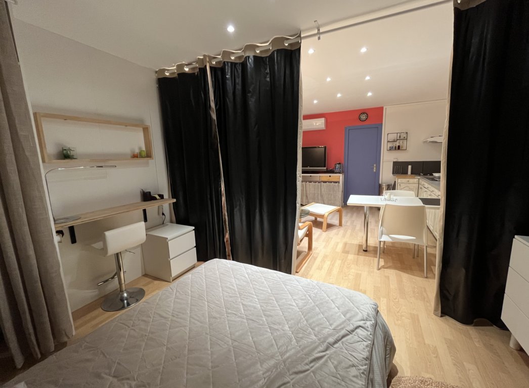 - cuisine/salon de17 m² + une chambre séparée par un rideau de 10 m² avec un espace travail dédié
