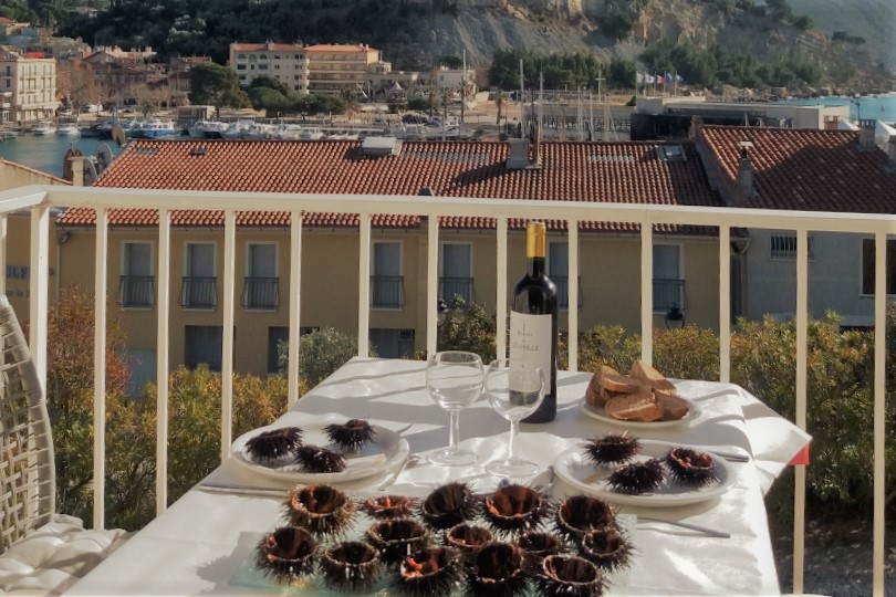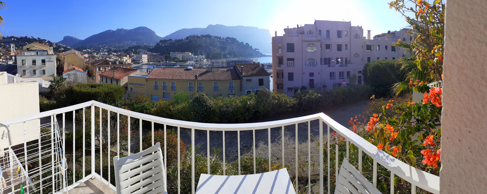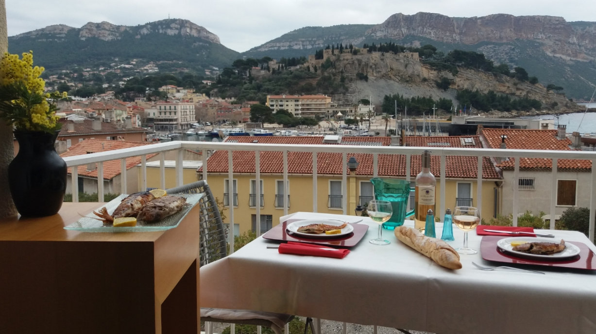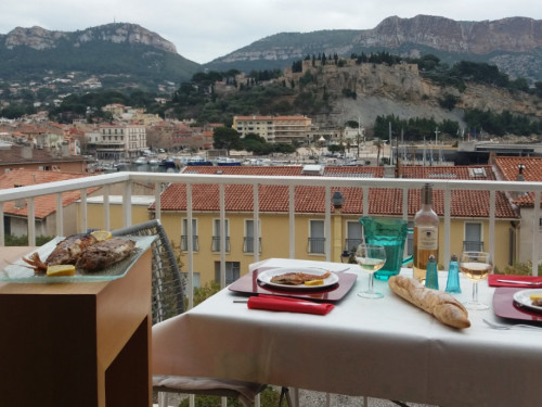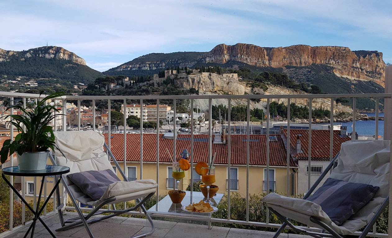 - balcon / terrasse avec table et chaises où vous pouvez prendre vos repas et petits déjeuners face au cap Canaille. Vous pouvez également vous détendre sur les transats mis à votre disposition