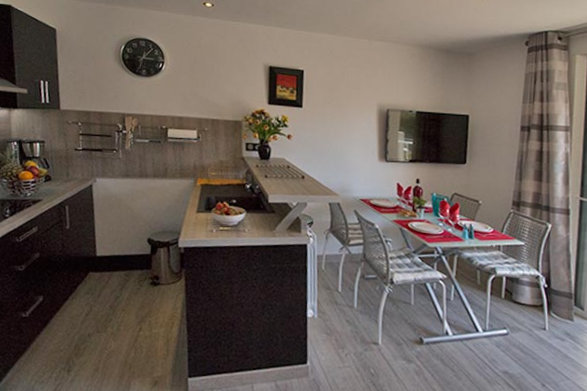 - cuisine américaine entièrement équipée : plaque induction, lave-vaisselle, lave-linge, four multifonctions, réfrigérateur-congélateur …