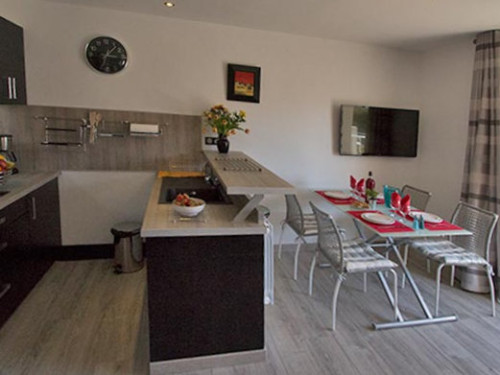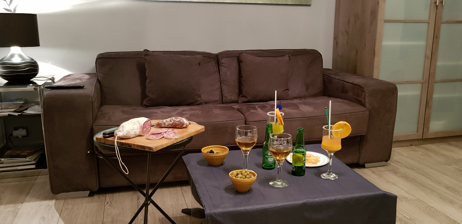 - d'une entrée séjour / salon, avec canapé-lit Rapido de haute qualité, armoire de rangement, télévision écran plat mural, coin repas