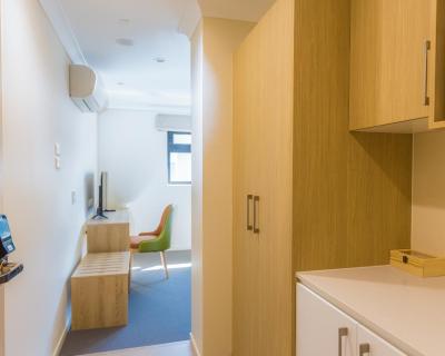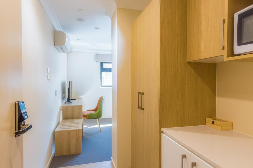 Located on the 5th level. Modern, compact studio with a large King bed and fully equipped kitchen. A work desk with TV is available in the bedroom. The studio is equipped with a modern en-suite bathroom.