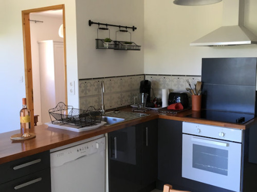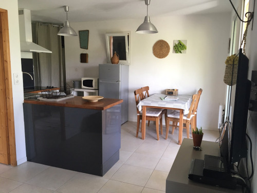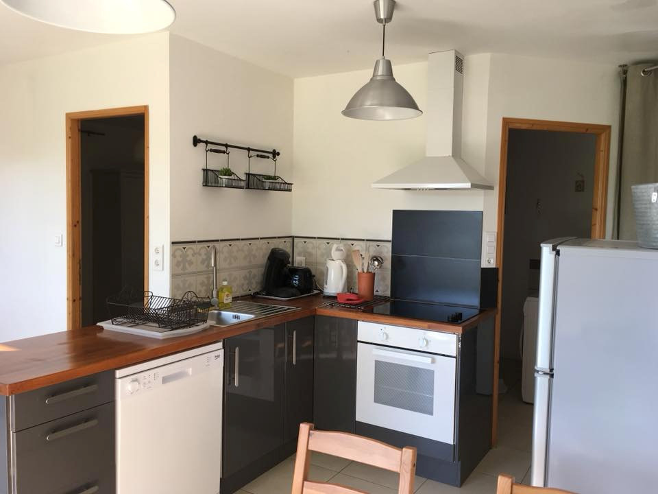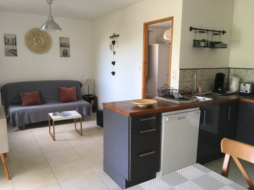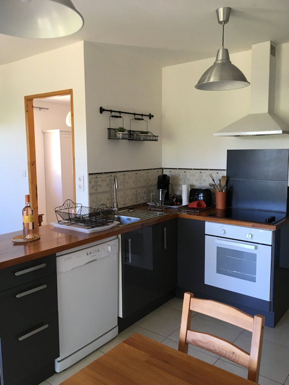 - d'une salle avec un canapé convertible (2 personnes, mat confortable 160x200), télévision à écran plat, cuisine entièrement équipée (lave-vaisselle, plaque vitrocéramique, four, hotte aspirante, micro-ondes, réfrigérateur avec congélateur, cafetière Senséo ou avec porte filtre, grille-pain, bouilloire électrique, fer à repasser …), baie vitrée