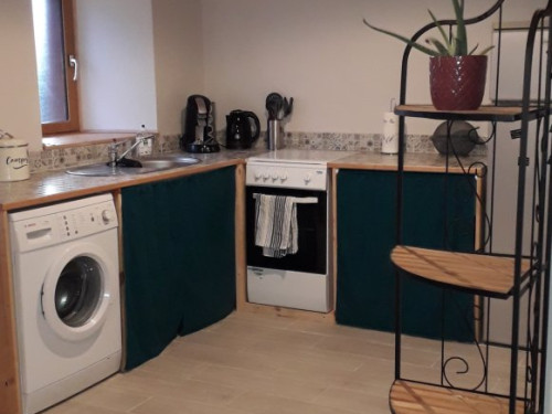 - cuisine : entièrement équipée, cuisinière gaz (détecteur de gaz), frigo/congélateur, cafetière Senseo (dosette souple), bouilloire, micro-ondes, grille-pain, lave-linge 7 kg, vaisselle, ustensiles de cuisines, torchons, essuie-mains