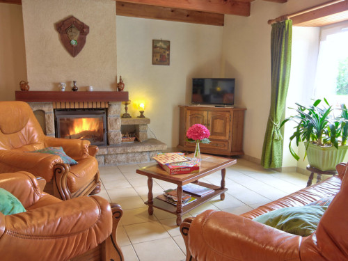 Séjour, coin cuisine agencé. Salon avec canapé et fauteuils, cheminée.