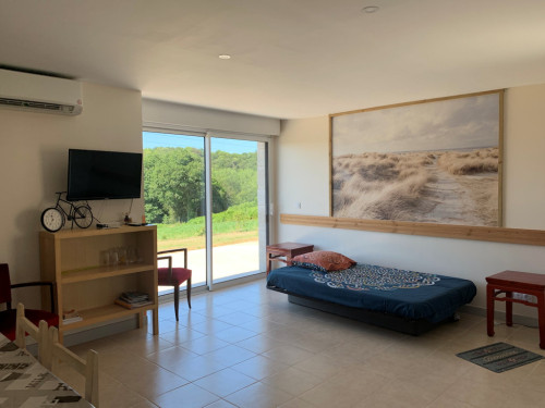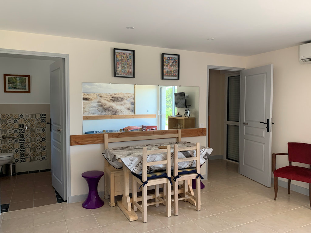 Appartement de plain-pied avec une salle à vivre, chambre séparée. Terrasse privative sur le jardin.