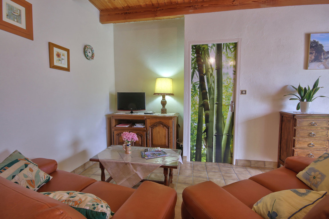 Séjour avec coin cuisine agencé. salon avec canapés.